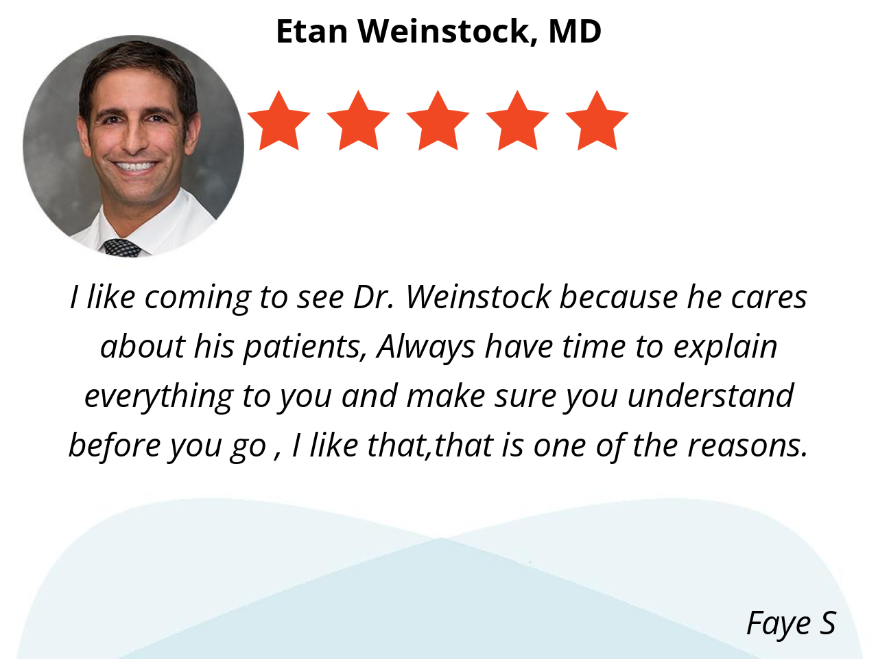 I like coming to see Dr. Weinstock because he cares about his patients, Always have time to explain everything to you and make sure you understand before you go , I like that,that is one of the reasons.