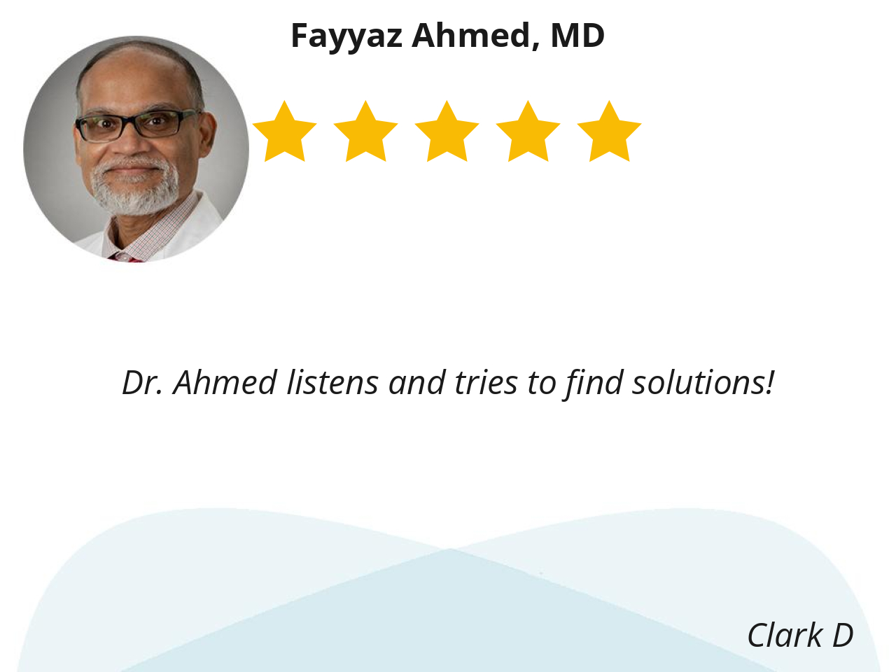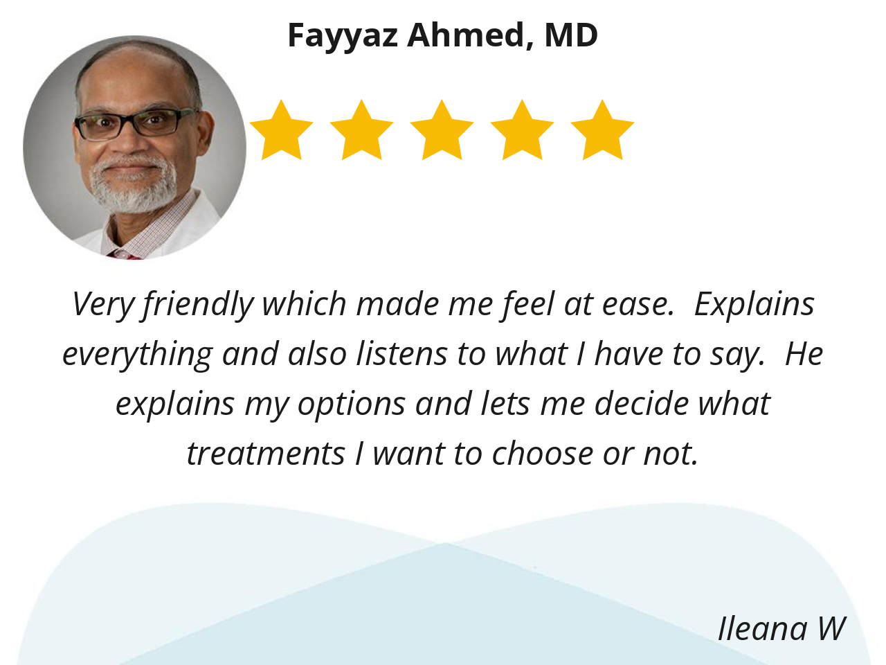 Dr Ahmed’s bed side manner is one of a kind! He is calm, thorough and compassionate. I am glad I have him as part of my care team.