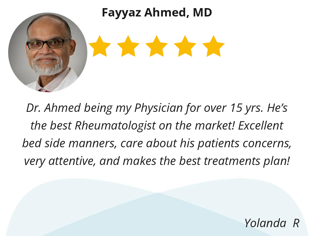 Dr. Ahmed being my Physician for over 15 yrs. He’s the best Rheumatologist on the market! Excellent bed side manners, care about his patients concerns, very attentive, and makes the best treatments plan!