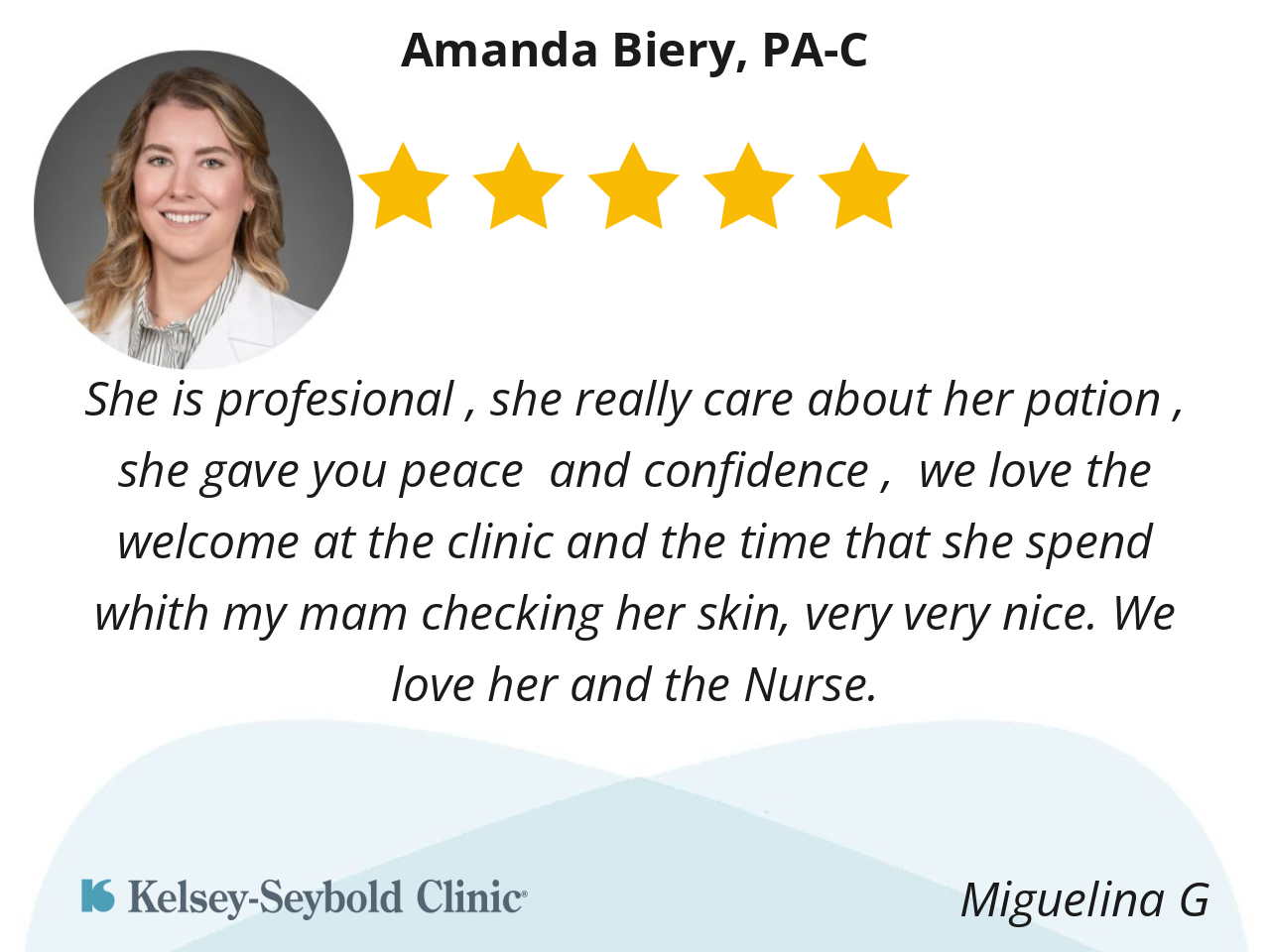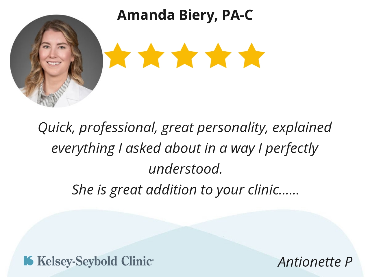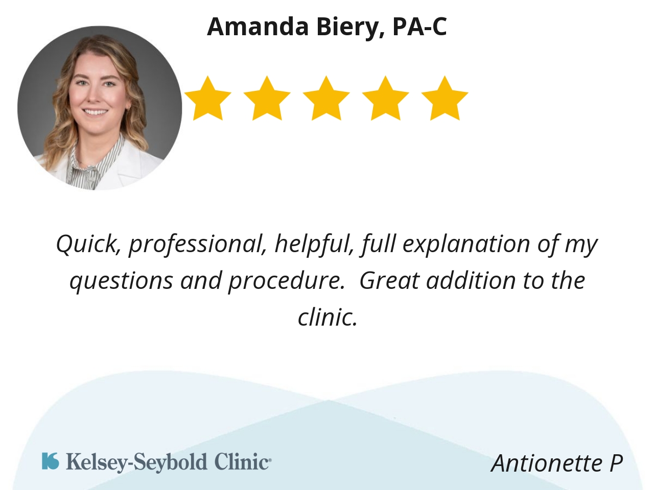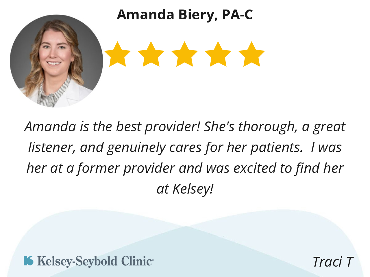Amanda is the best provider! She's thorough, a great listener, and genuinely cares for her patients. I was her at a former provider and was excited to find her at Kelsey!