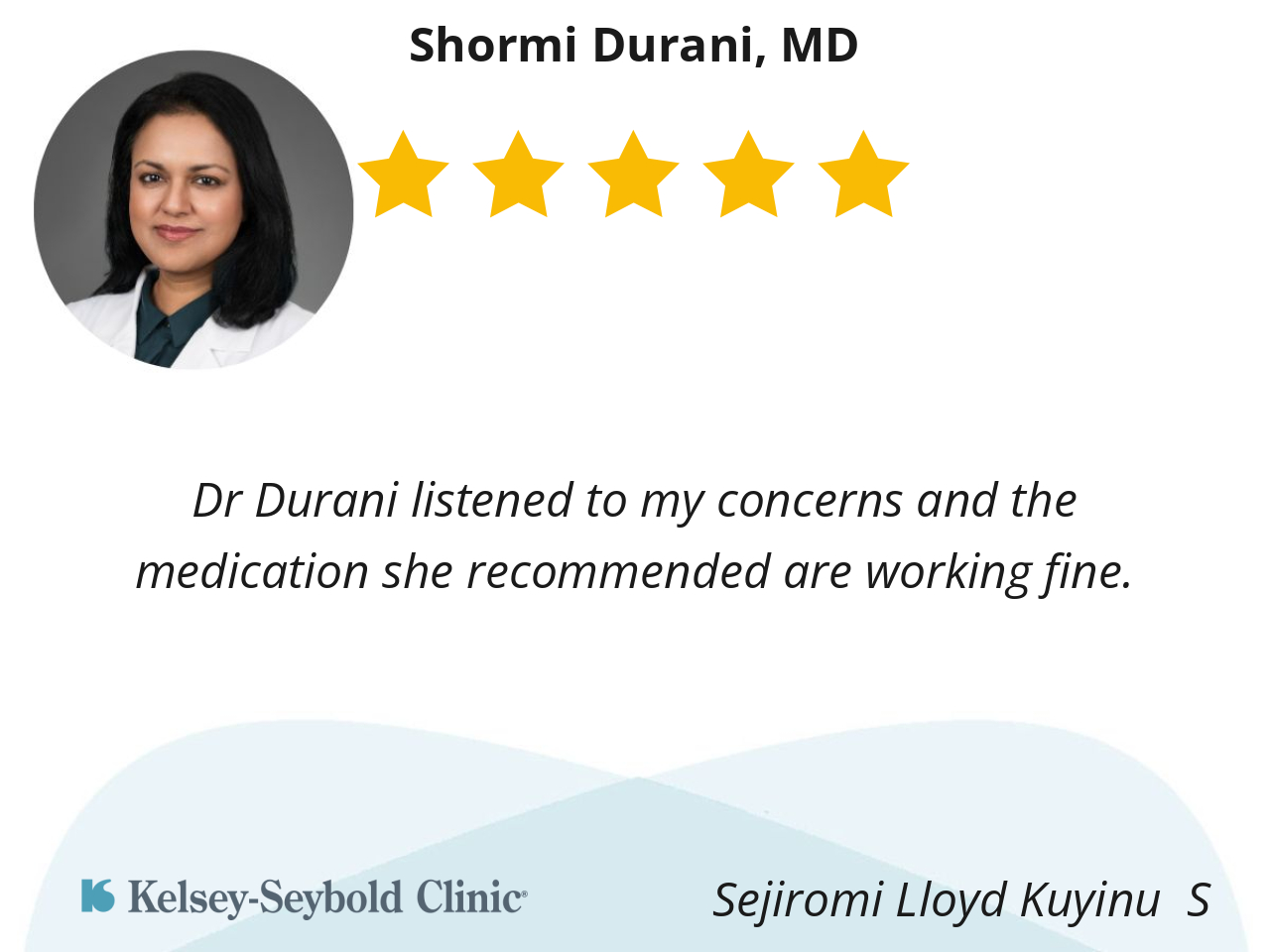 Dr. Durani is an excellent doctor. She listened and showed genuine concern. She is also very knowledgeable. I find all of the doctors at Kelsey are great. I’ve not gone to one that I did not like.