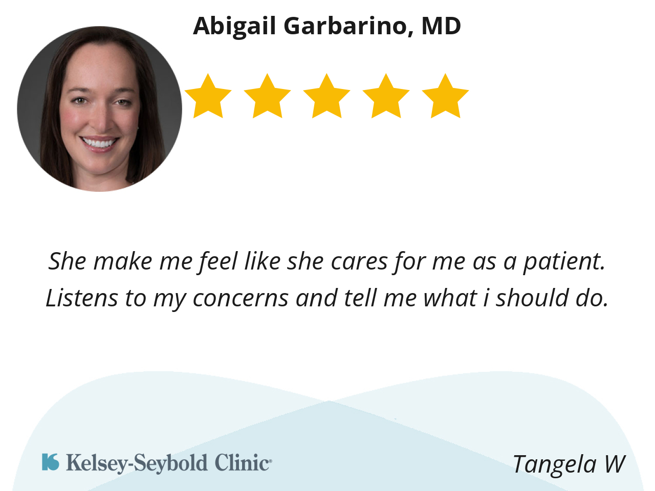 Dr. Garbarino always talks through all of my concerns and gives great advice. She is a great listener, and she makes you feel part of the decision making in your healthcare rather than other physicians I’ve seen who talk down at you.