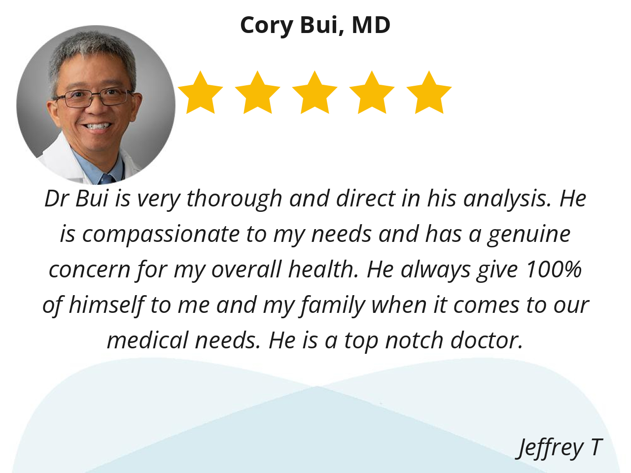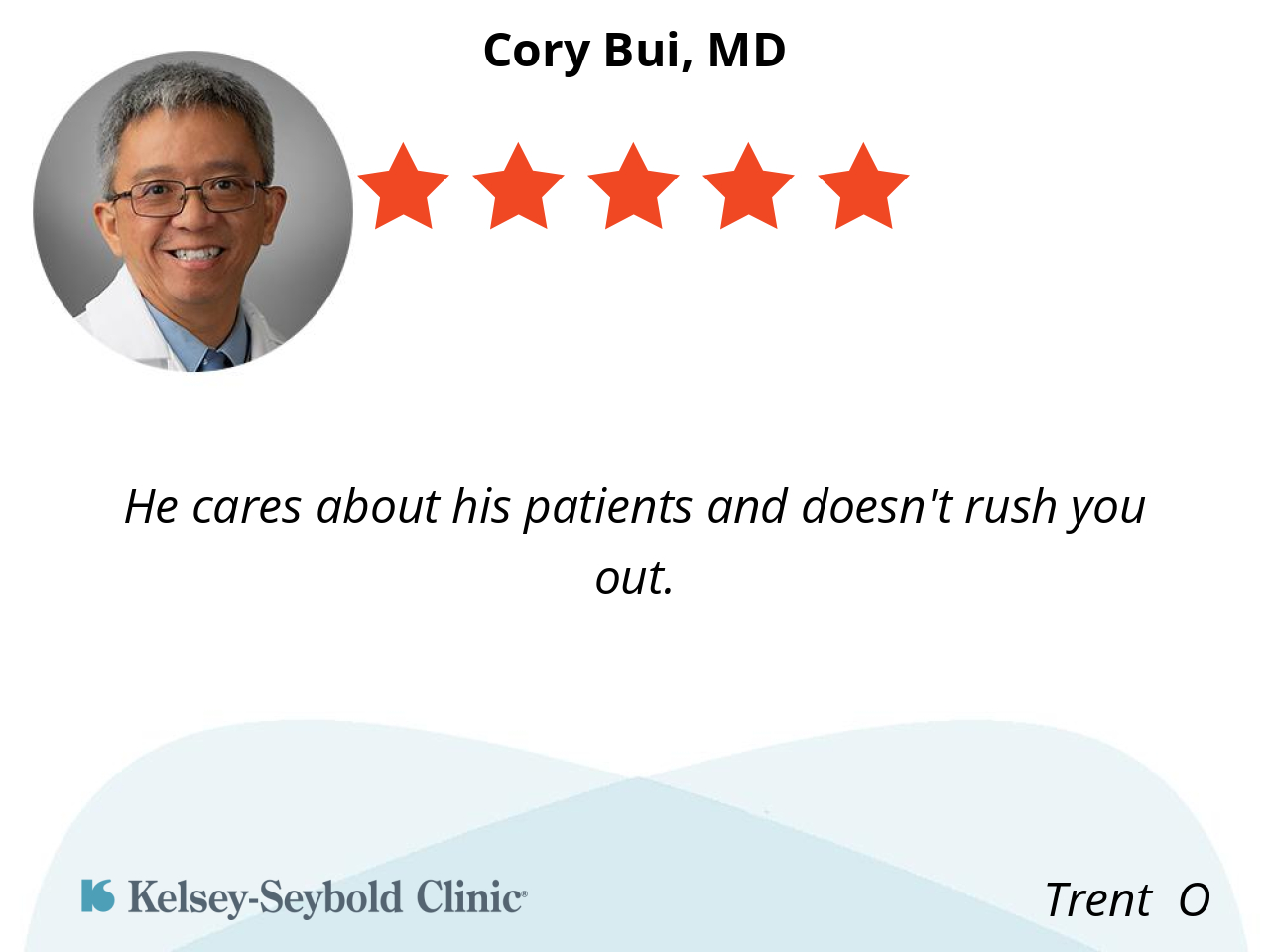 Dr Bui is very thorough and direct in his analysis. He is compassionate to my needs and has a genuine concern for my overall health. He always give 100% of himself to me and my family when it comes to our medical needs. He is a top notch doctor.