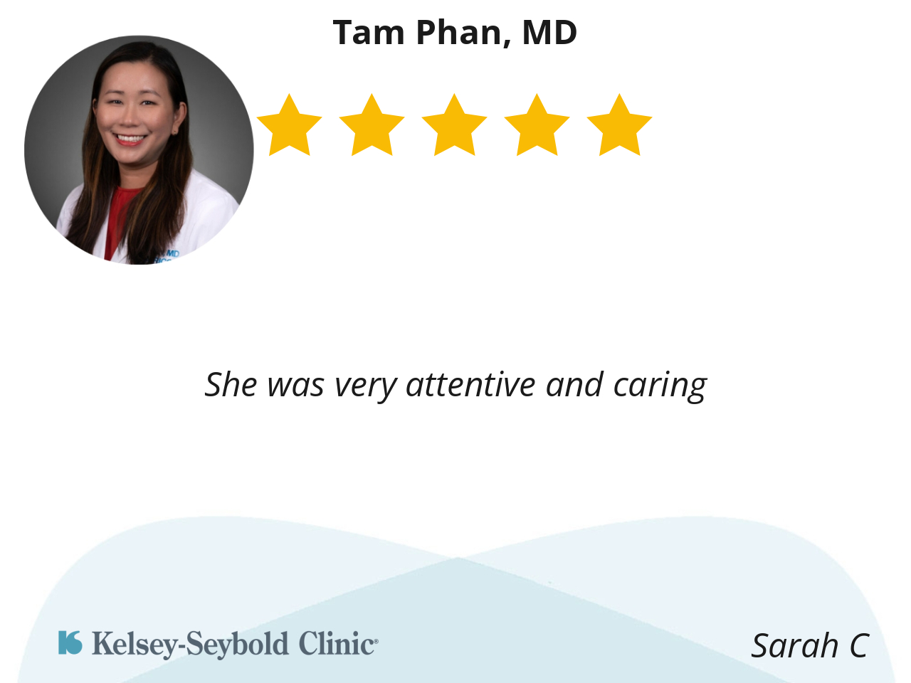 We had a wonderful experience with Dr. Phan for our very first visit to Kelsey Seybold at Meyerland. She was very patient and kind towards my 2 year old son. She was also super helpful with all of my questions as well and responds quickly to lab results. Great pediatrician!