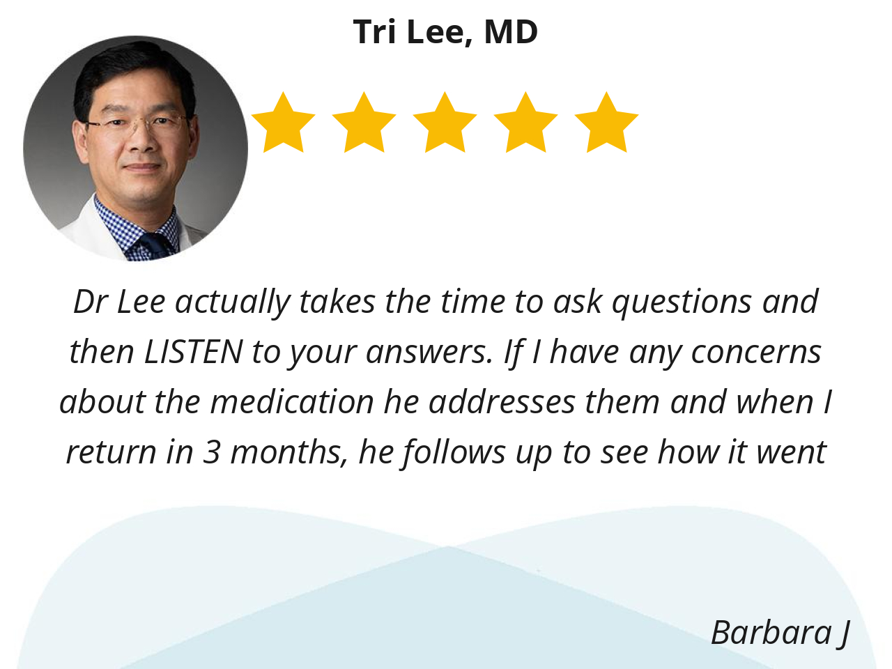 Dr Lee actually takes the time to ask questions and then LISTEN to your answers. If I have any concerns about the medication he addresses them and when I return in 3 months, he follows up to see how it went