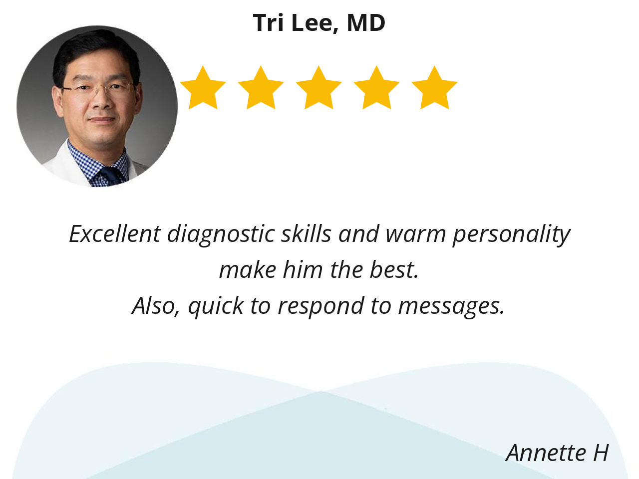 Truly genuine complete I’m blessed to have him as my endocrinologist. Dr. Lee is the main reason I’m still a Kelsey patient.