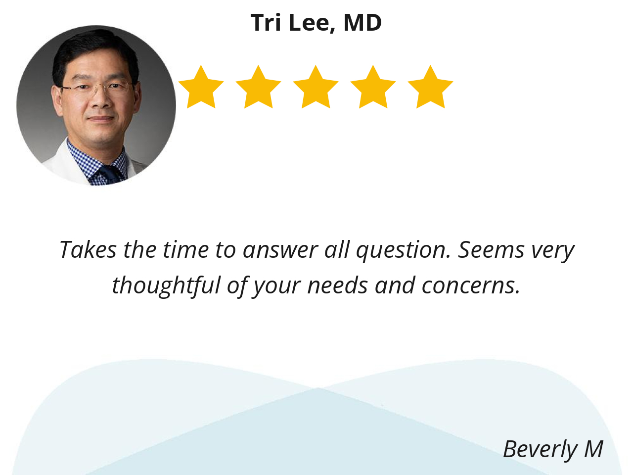 Dr Lee is very thorough and patient with me. He answers all my questions and concerns.