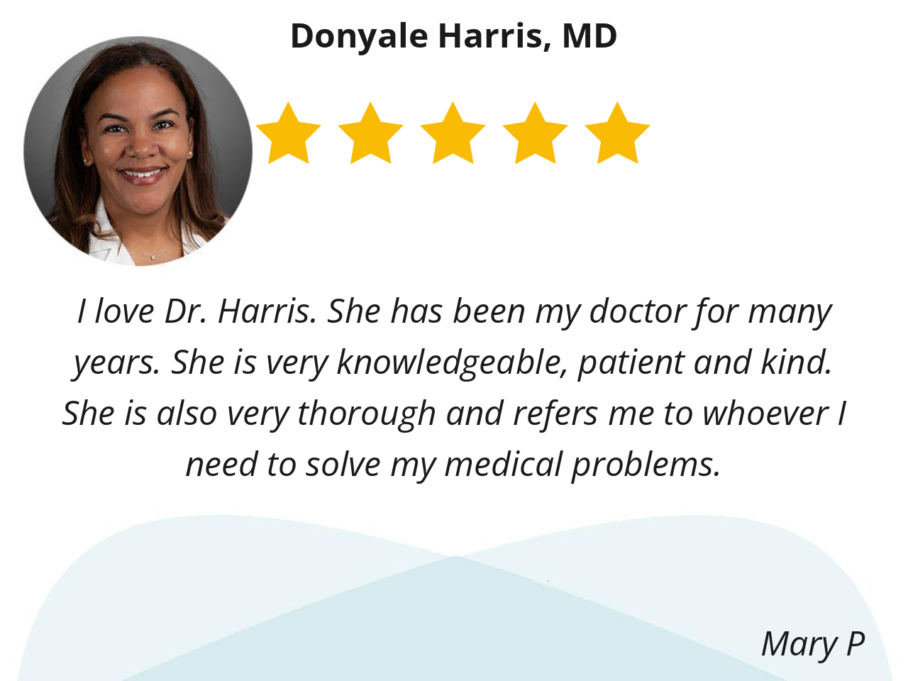 Dr. Harris is competent and caring. She takes the time to listen and address all my concerns. I still credit her for saving my life but taking action when my kidney function was abnormal. A sonogram revealed kidney cancer in an early stage and was removed before it destroyed the whole kidney and spread to other parts of my body.