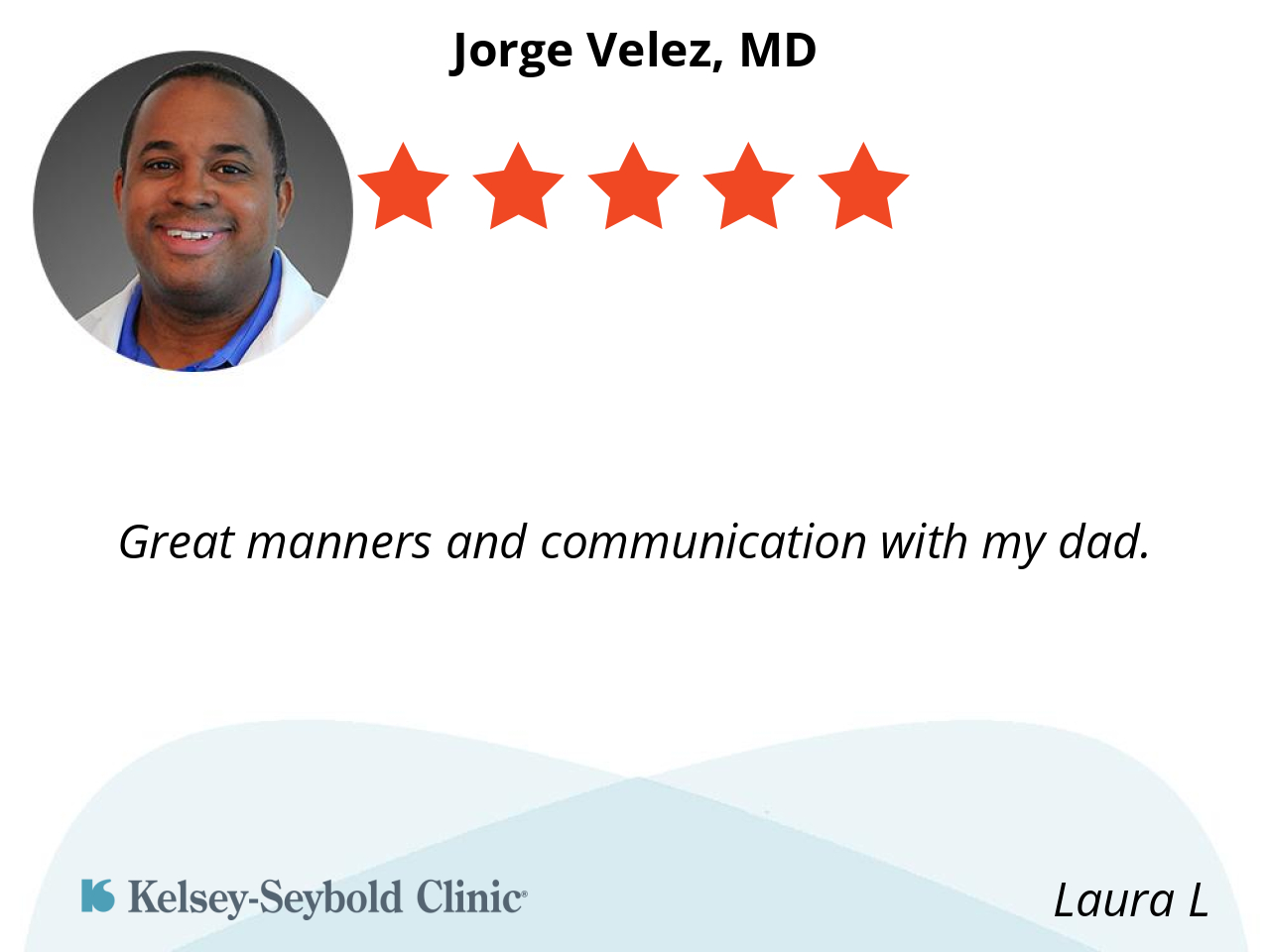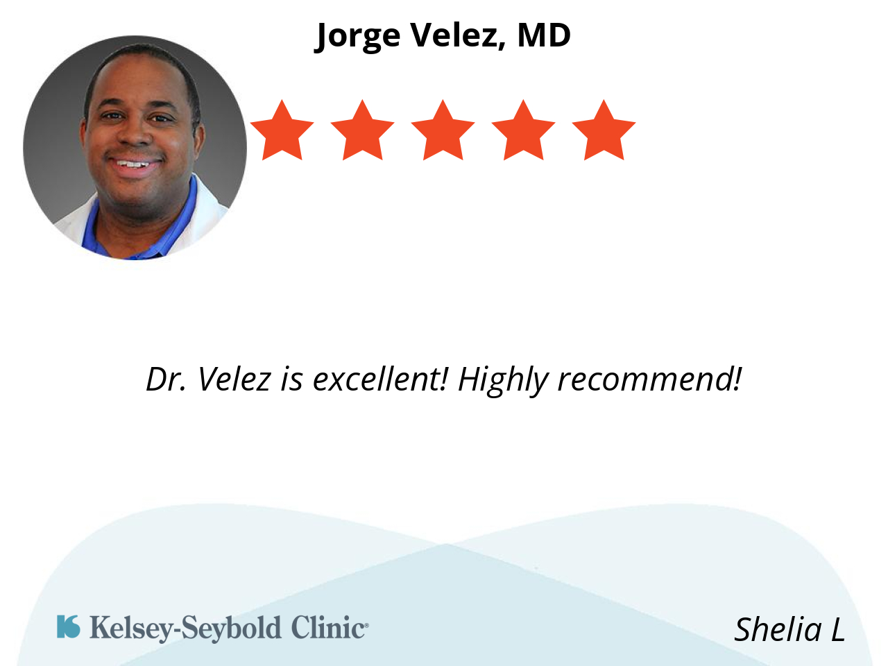 Dr. Jorge Velez, is compassionate an I highly value him because he take the time to explain the dynamics of my problem, listen to concerns, and demonstrate a caring attitude, rather than rushing through my appointment. I trust Dr. Jorge Velez prognosis's.