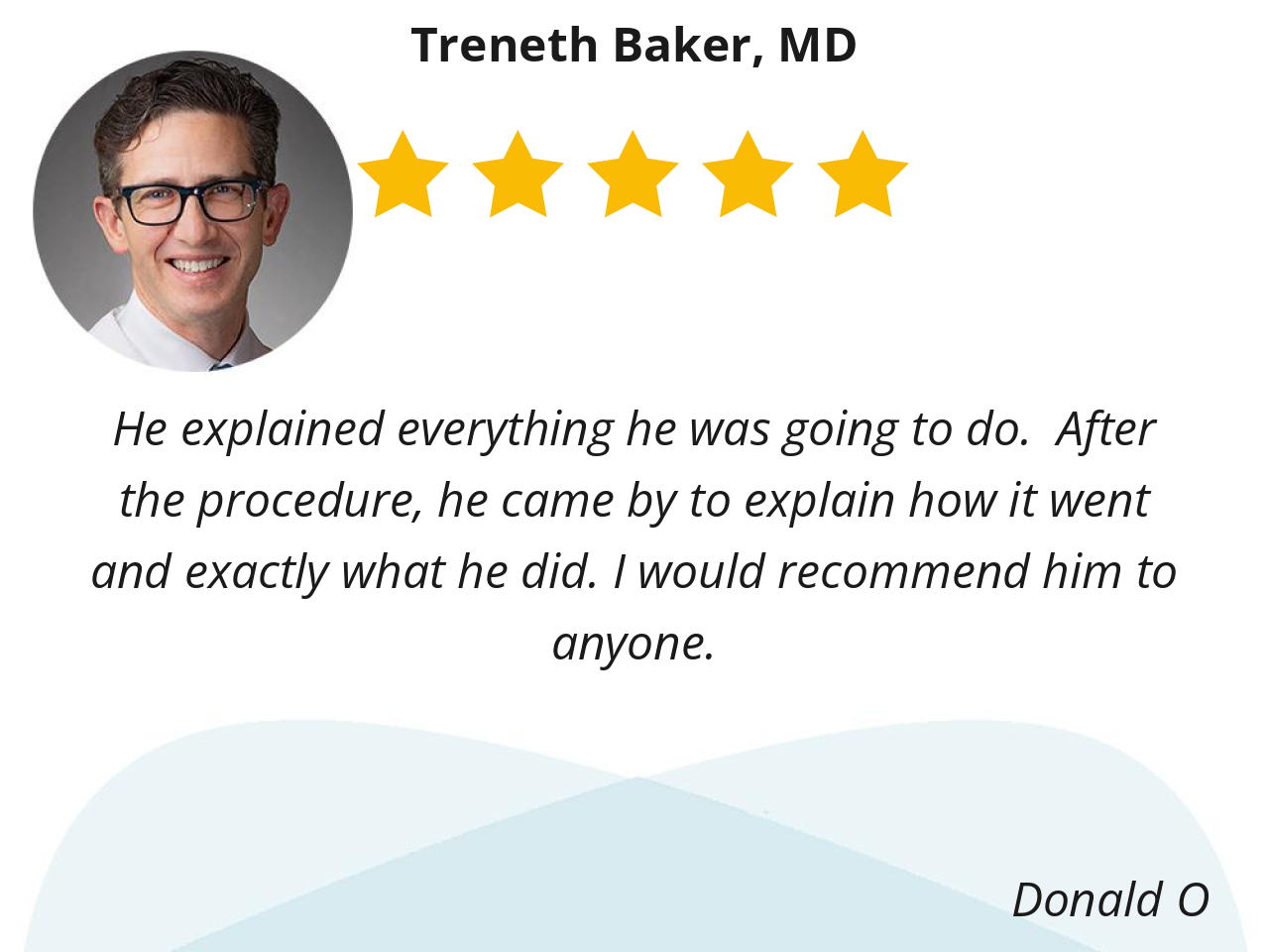 Dr. Baker is a very pleasant man. He was very detailed explaining what I would encounter with my surgery. He talked to me after the surgery to let me know everything went well. During the follow up video appointment he answered all my questions and explained all of the lab results. He’s just an all-around good doctor and a good person! I would have no problem recommending him to anyone who needs general surgery performed.