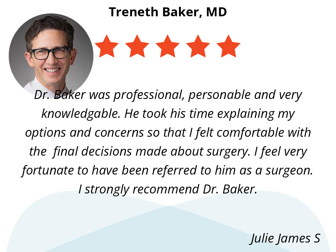 Dr. Baker was professional, personable and very knowledgable. He took his time explaining my options and concerns so that I felt comfortable with the final decisions made about surgery. I feel very fortunate to have been referred to him as a surgeon. I strongly recommend Dr. Baker.