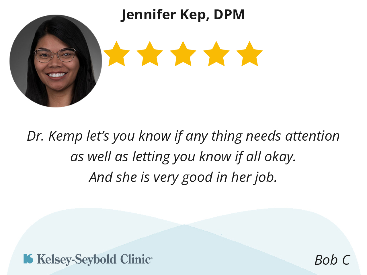 This was the first time I for me to be seen by Dr. Kep. I loved her no nonsense approach with a great bedside manner. She was easy to talk with and she gave me great care for my foot issues.