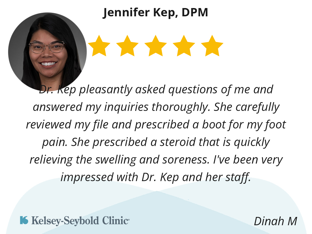 Dr. Kep pleasantly asked questions of me and answered my inquiries thoroughly. She carefully reviewed my file and prescribed a boot for my foot pain. She prescribed a steroid that is quickly relieving the swelling and soreness. I've been very impressed with Dr. Kep and her staff.