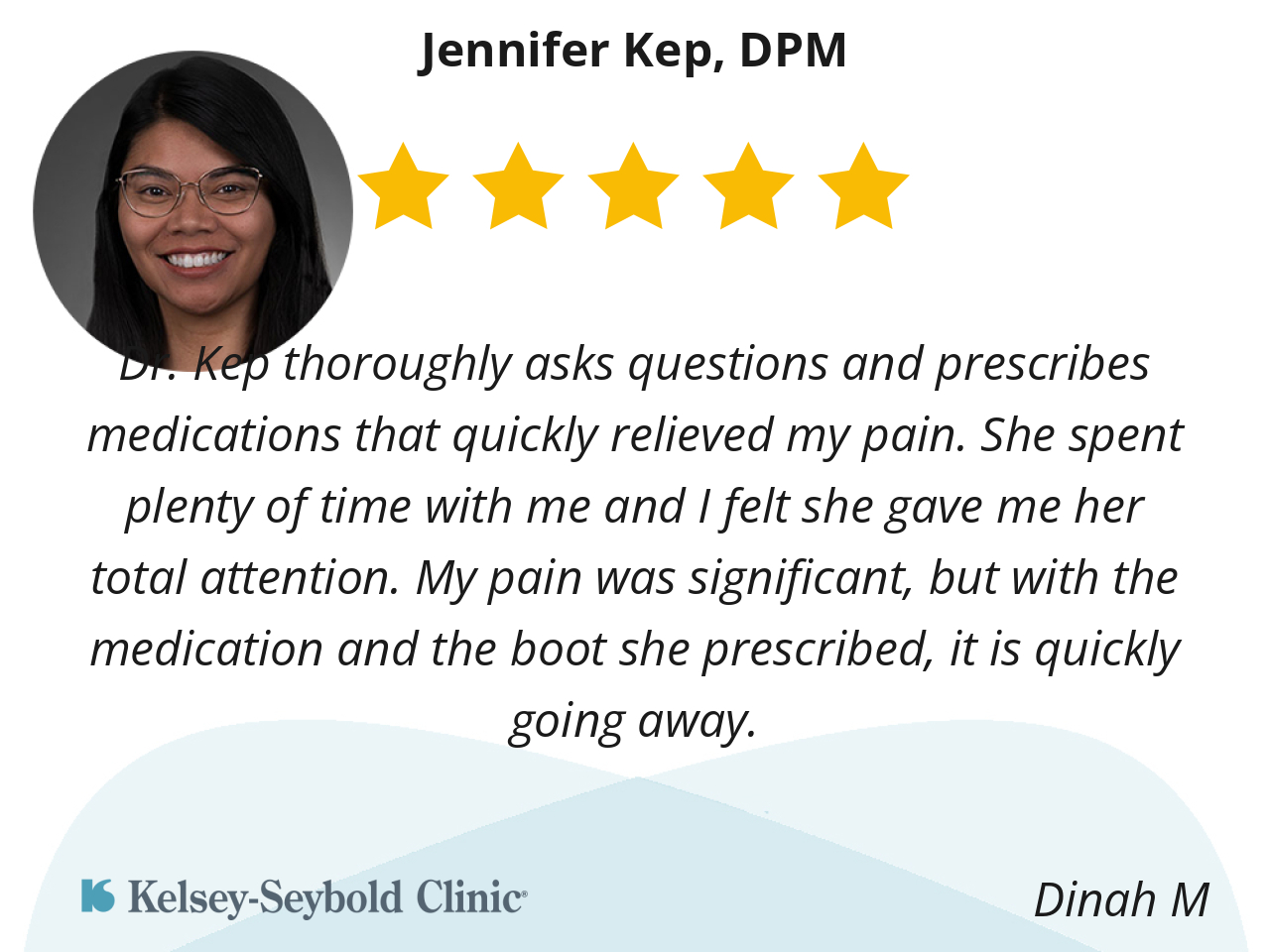 Dr. Kep thoroughly asks questions and prescribes medications that quickly relieved my pain. She spent plenty of time with me and I felt she gave me her total attention. My pain was significant, but with the medication and the boot she prescribed, it is quickly going away.