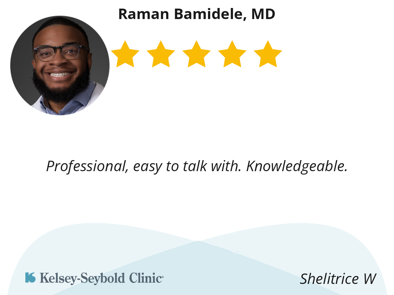 I like Dr. Bamidele because he is a very knowledgeable, caring, professional, and respectful person as well as physician, He displays I care values. He patiently listens to my concerns and asks questions to make sure I understand. I leave a happy patient