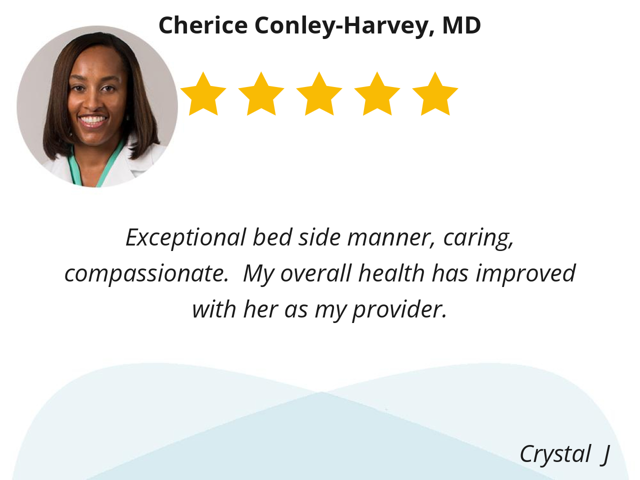 Dr. Conley-Harvey is kind and caring. She listens to my concerns. Her bedside manner is exceptional.
