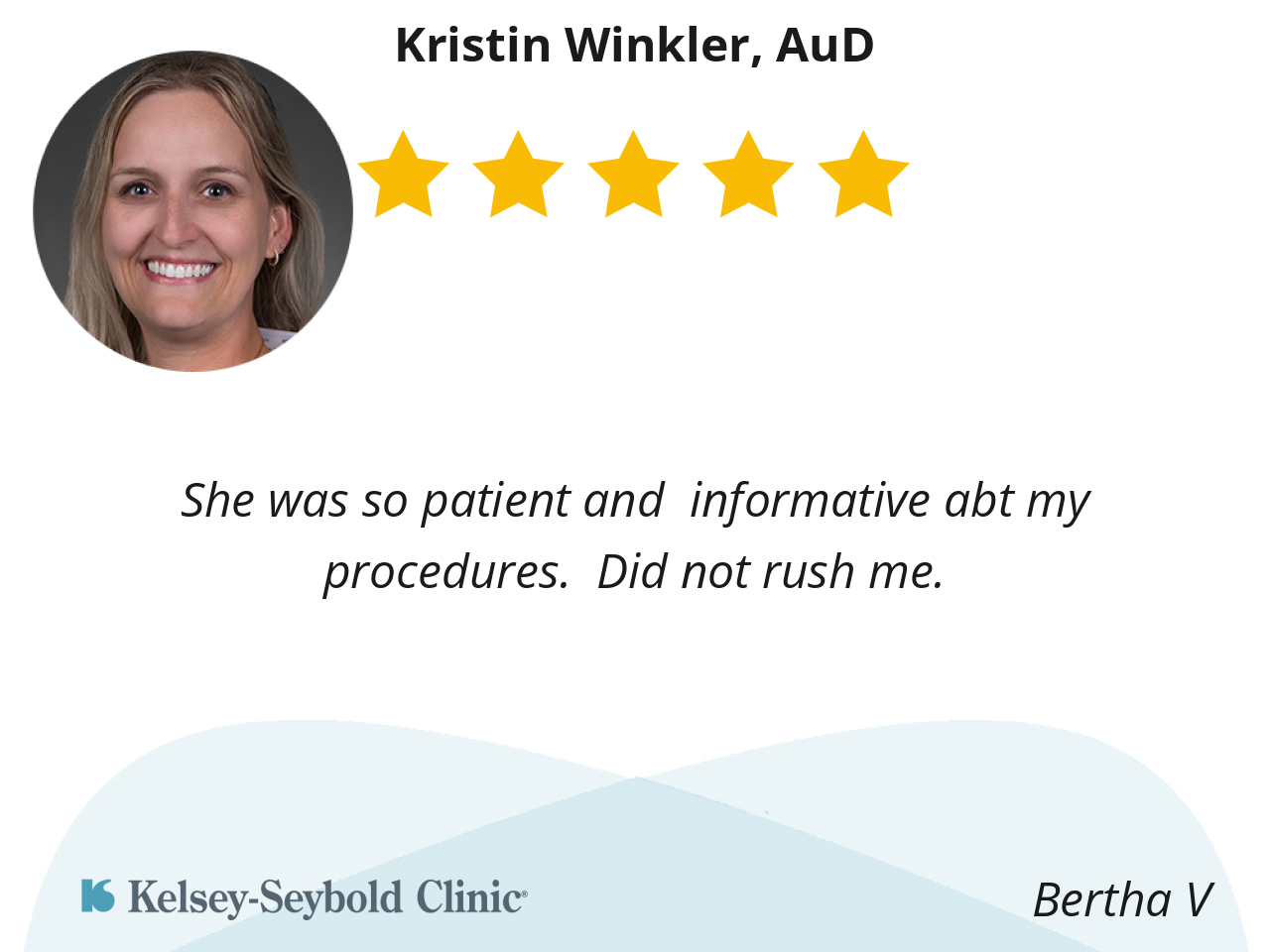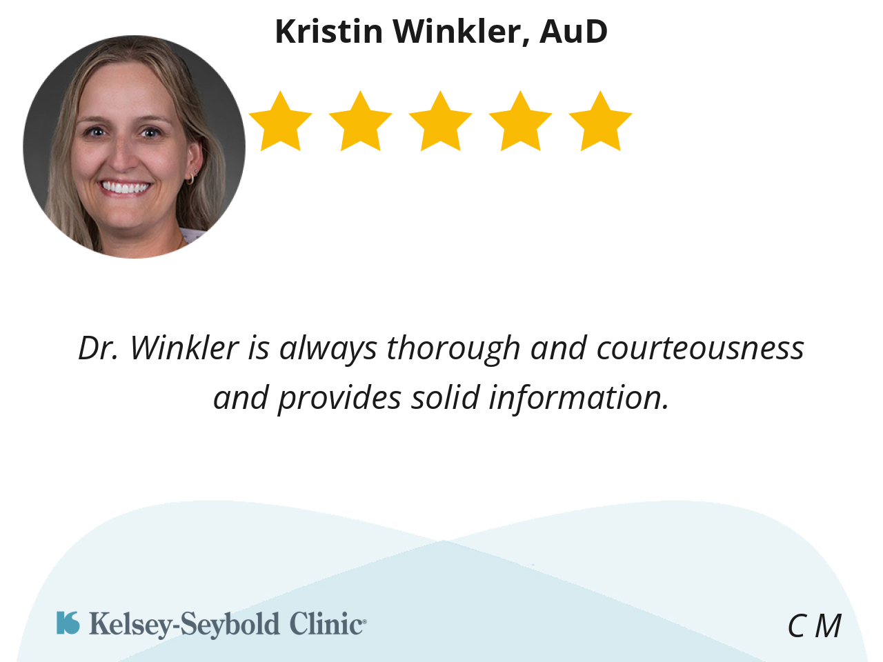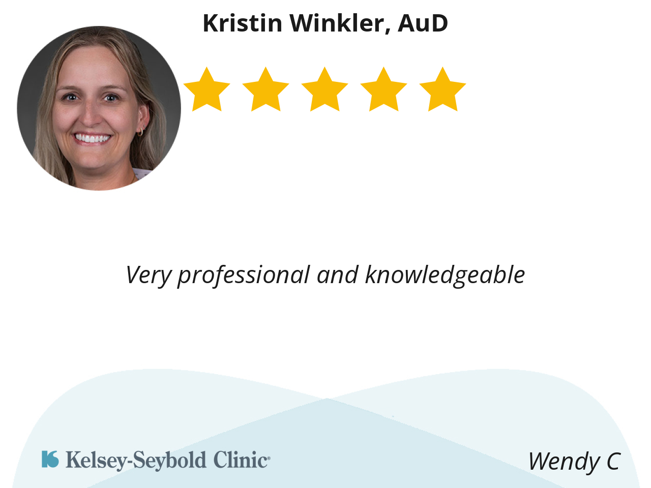 Kristin Winkler was so very helpful during my appointment. She explained what she was doing every step of the way and guided me on how to best use and care for my first hearing aid. I will recommend Kristin Winkler very highly to any of my friends needing hearing aids.