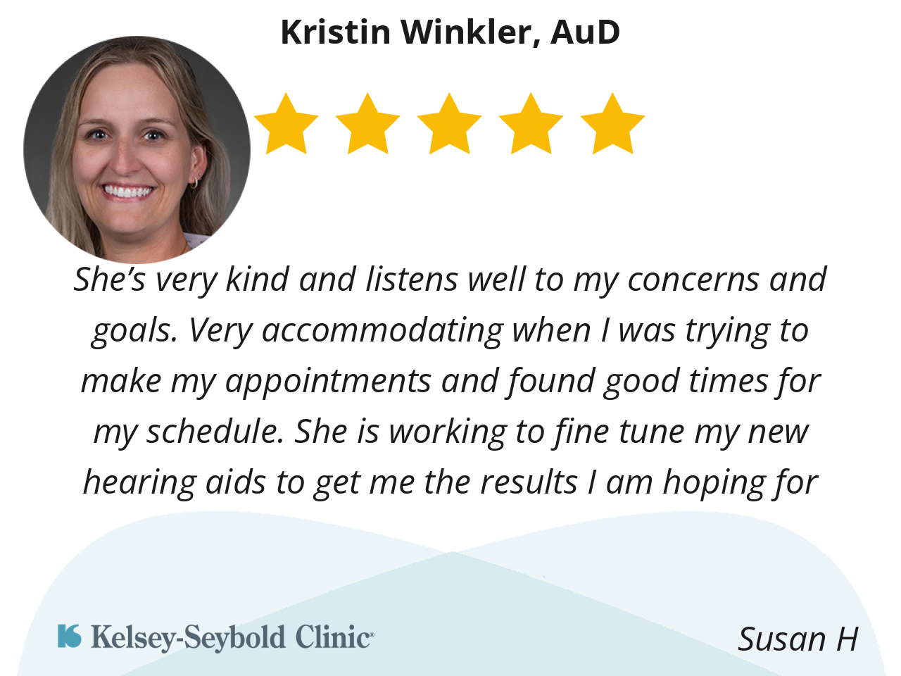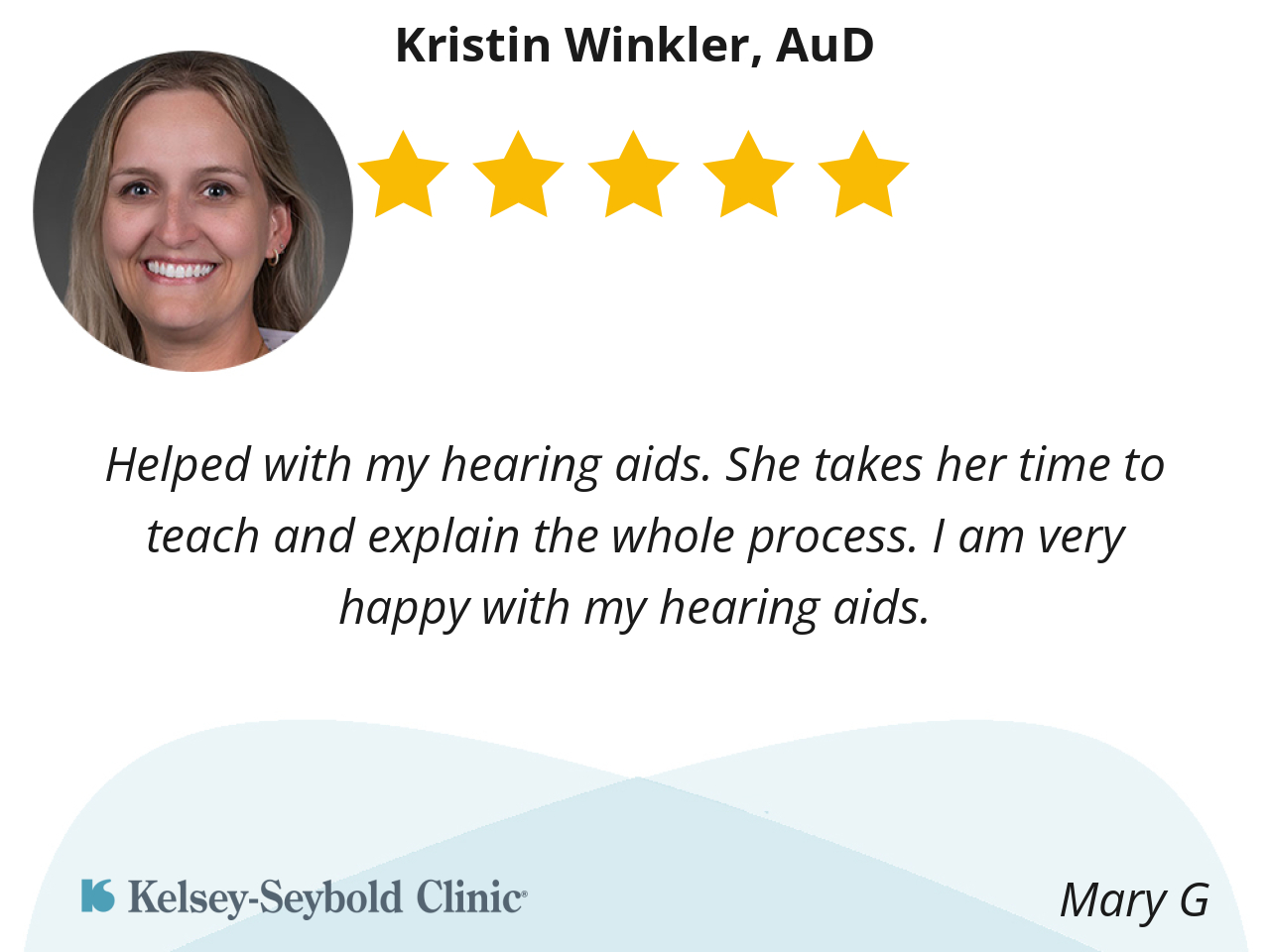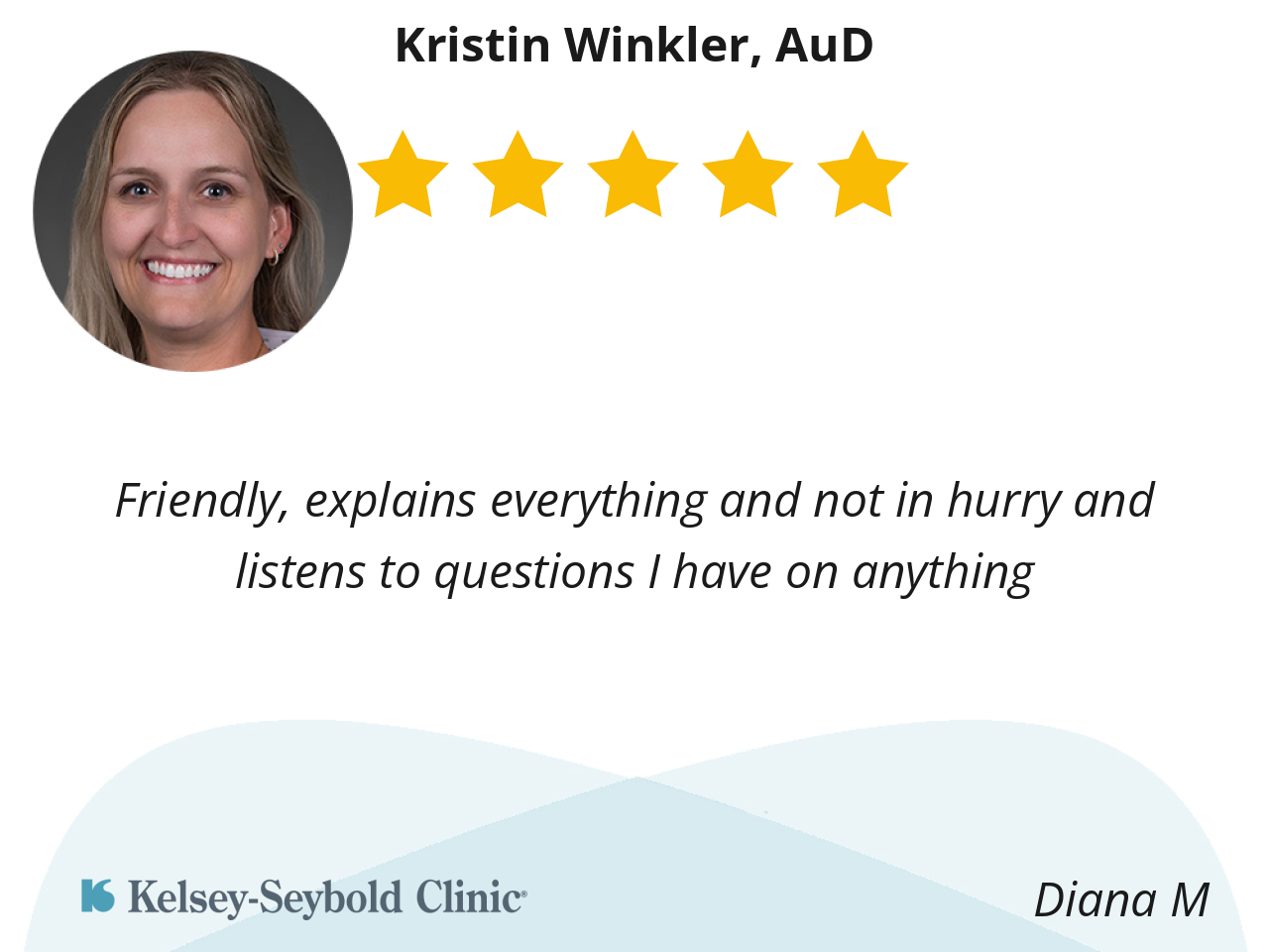 Kristin Winkler was so very helpful during my appointment. She explained what she was doing every step of the way and guided me on how to best use and care for my first hearing aid. I will recommend Kristin Winkler very highly to any of my friends needing hearing aids.