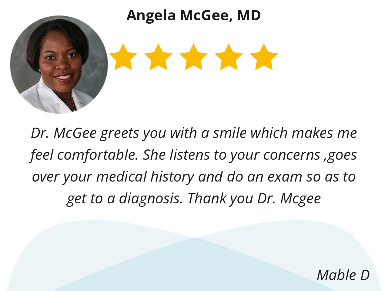 Dr. McGee greets you with a smile which makes me feel comfortable. She listens to your concerns ,goes over your medical history and do an exam so as to get to a diagnosis. Thank you Dr. Mcgee