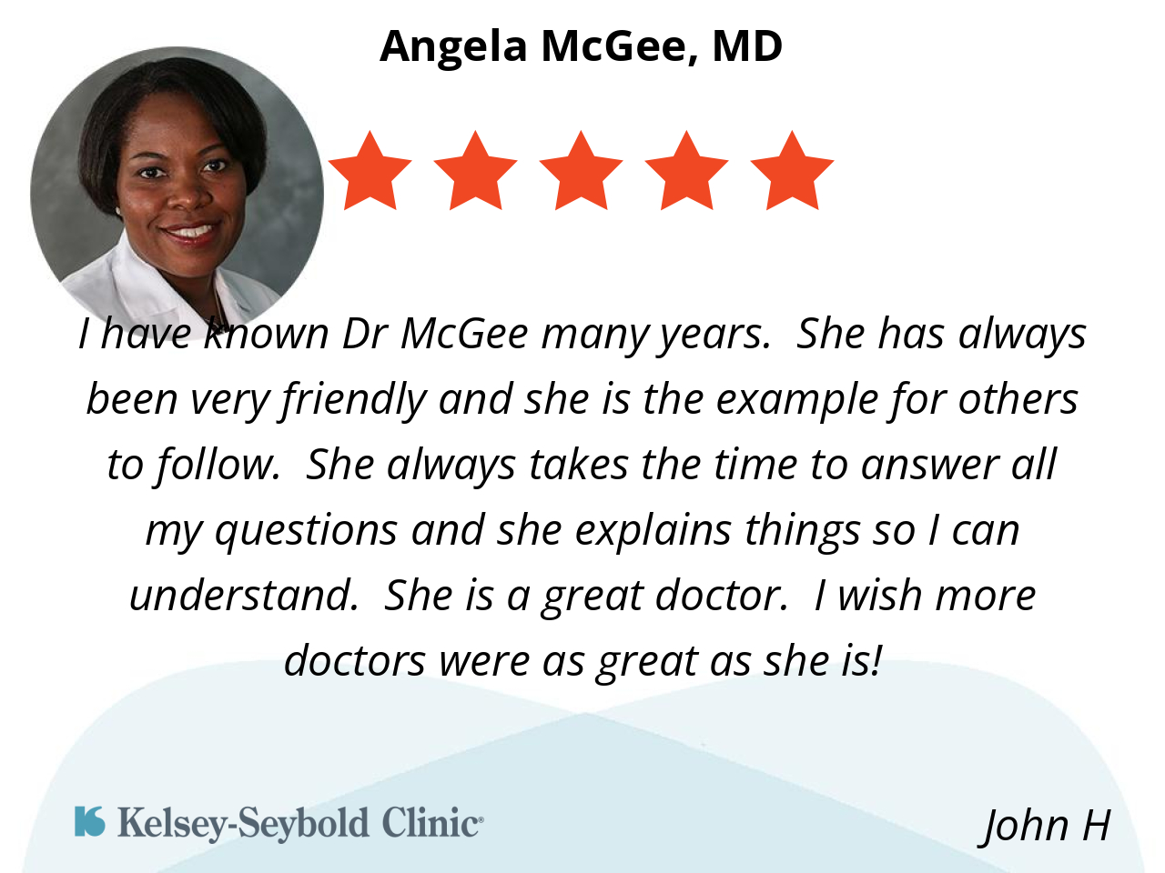 I have known Dr McGee many years. She has always been very friendly and she is the example for others to follow. She always takes the time to answer all my questions and she explains things so I can understand. She is a great doctor. I wish more doctors were as great as she is!