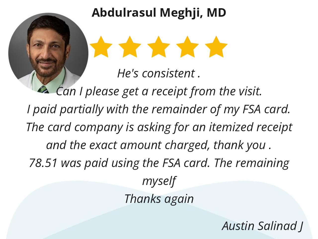 Dr. Meghji is very knowledgeable and thorough. He is attentive and does not spend an inordinate amount of time on small talk.