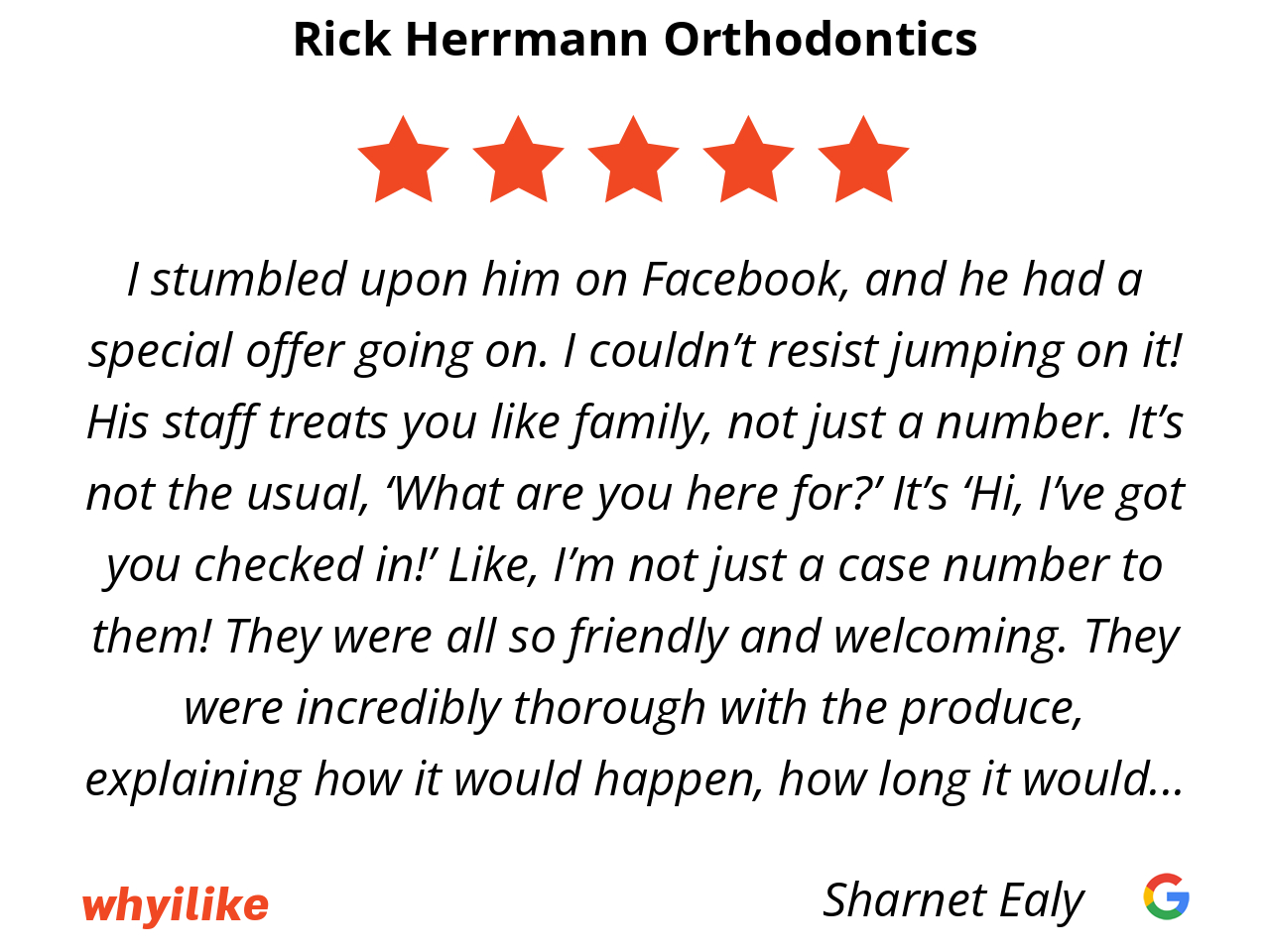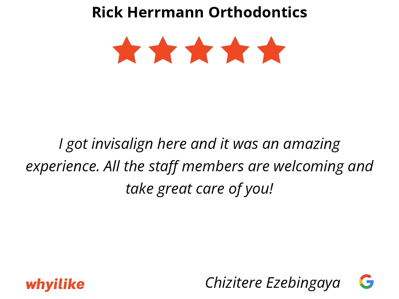 I can’t say enough good things about Dr. Rick Herrmann and his incredible team! I was in treatment for 18 months, and my only regret is not doing this sooner. At 40, I finally decided it was time to invest in my smile—something I had struggled with for most of my life. From the very first consultation to my final appointment, Dr. Herrmann and his team made the entire process smooth, encouraging, and even enjoyable. Their professionalism, kindness, and attention to detail were top-notch. Honestly, in a strange way, I’ll miss my visits—they made me feel like part of the family. If you're considering orthodontic treatment, don't wait. You're in the best hands with Dr. Herrmann and his team!
