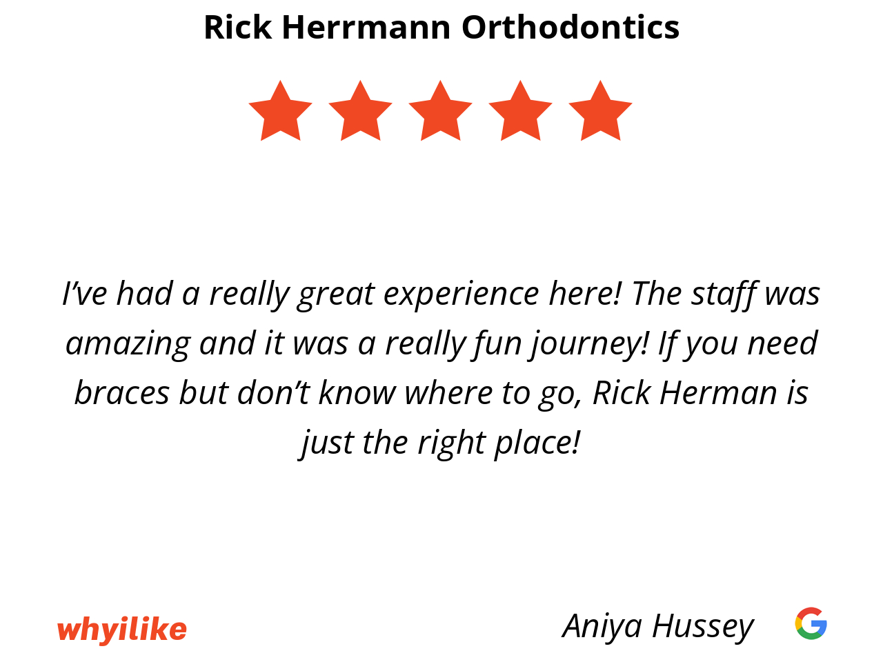 I’ve had a really great experience here! The staff was amazing and it was a really fun journey! If you need braces but don’t know where to go, Rick Herman is just the right place!