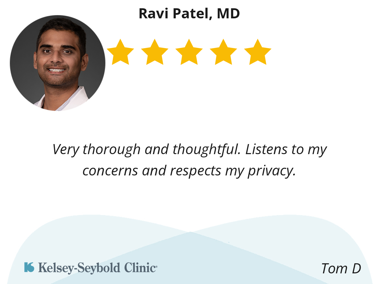 Ravi Patel is a friendly young doctor who listens to your questions and and did not try and rush me as an older patient out of the office as some other younger doctors often do. THANK YOU !!!