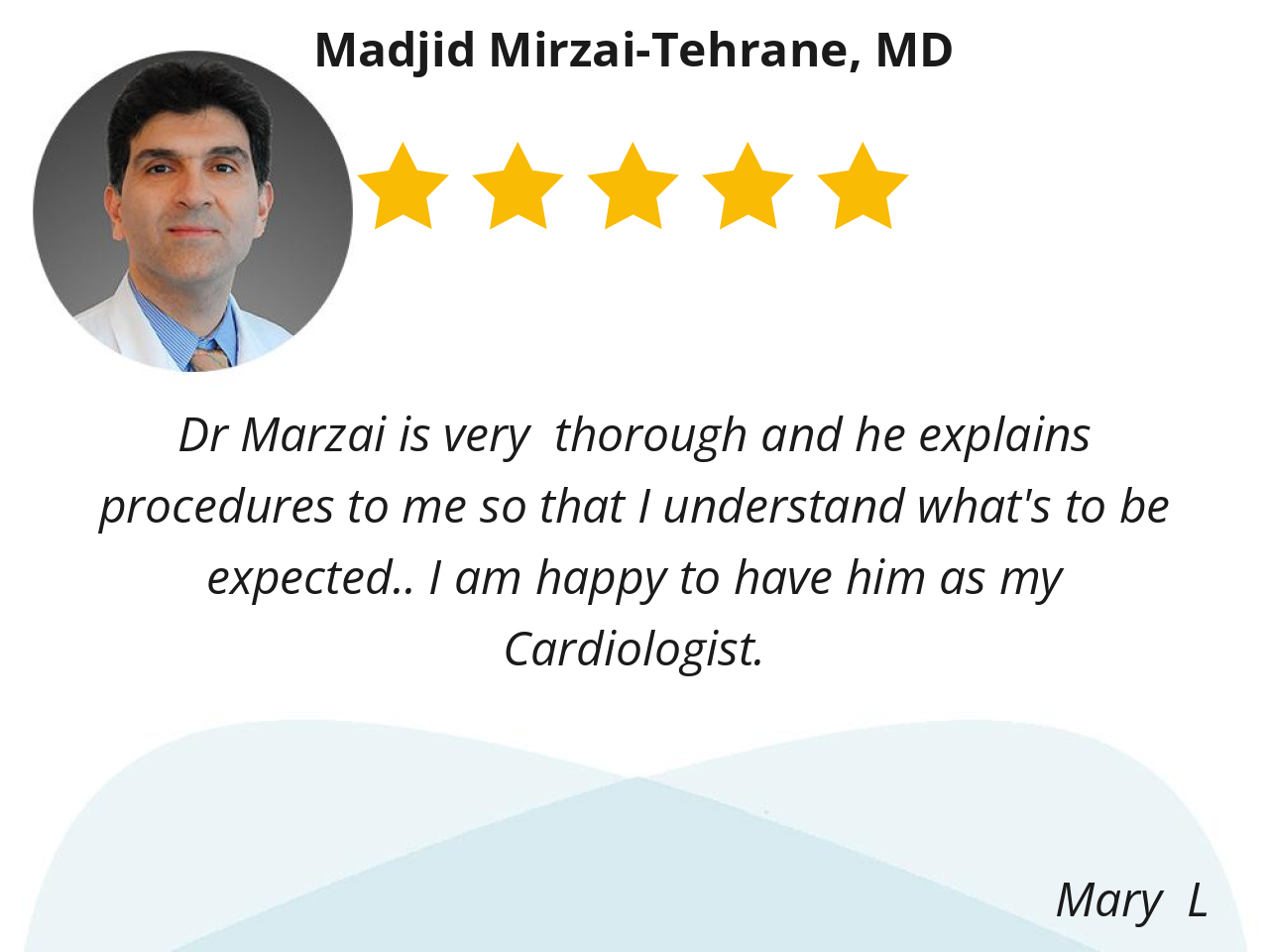 Dr Marzai is very thorough and he explains procedures to me so that I understand what's to be expected.. I am happy to have him as my Cardiologist.