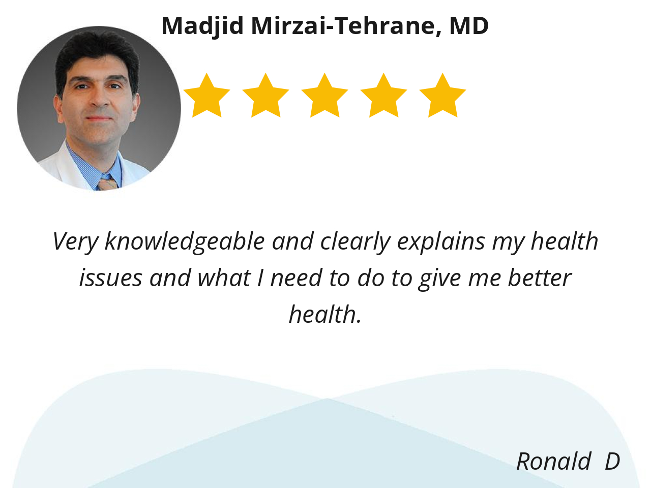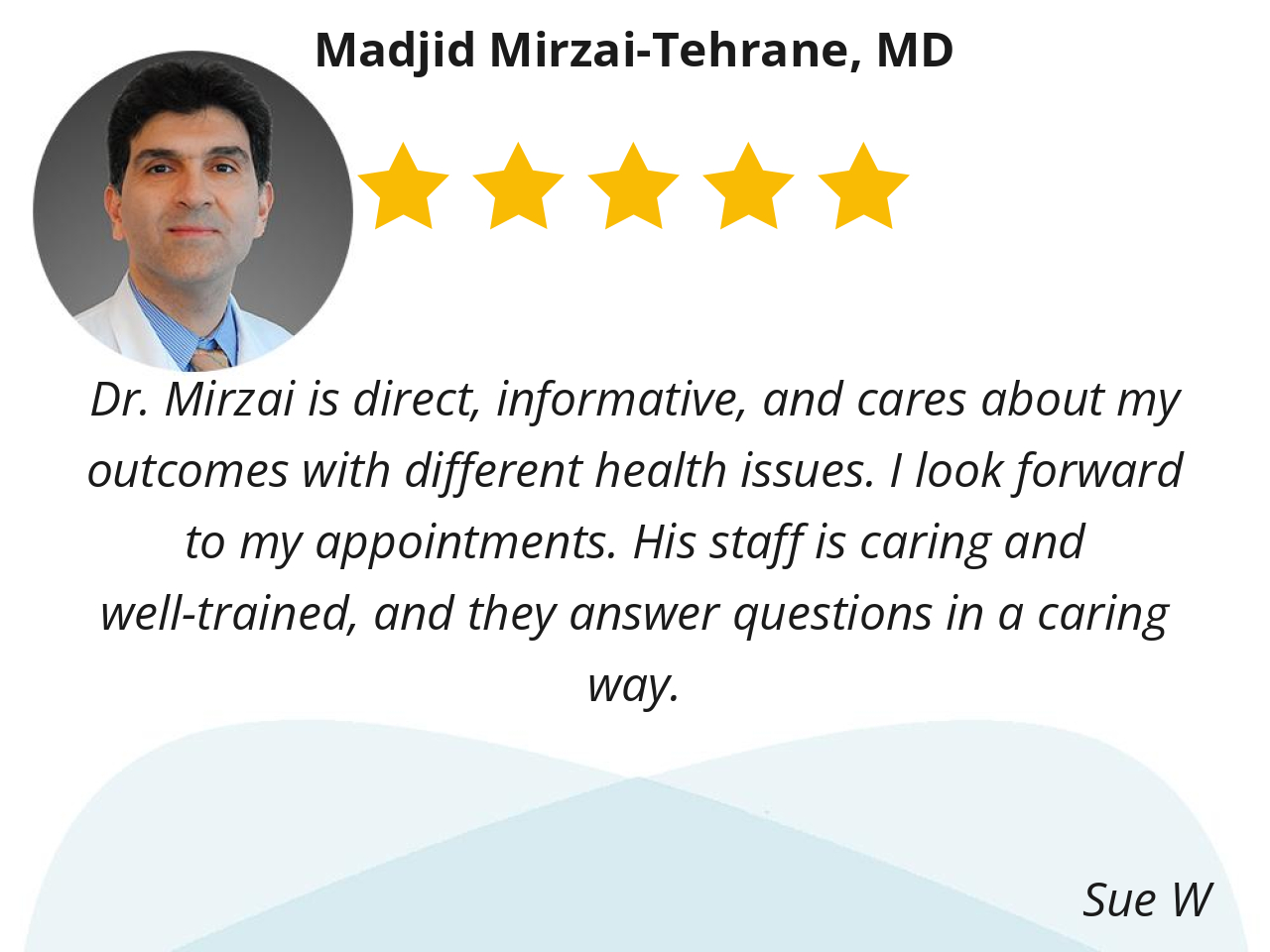 Dr. Mirzai is direct, informative, and cares about my outcomes with different health issues. I look forward to my appointments. His staff is caring and well-trained, and they answer questions in a caring way.