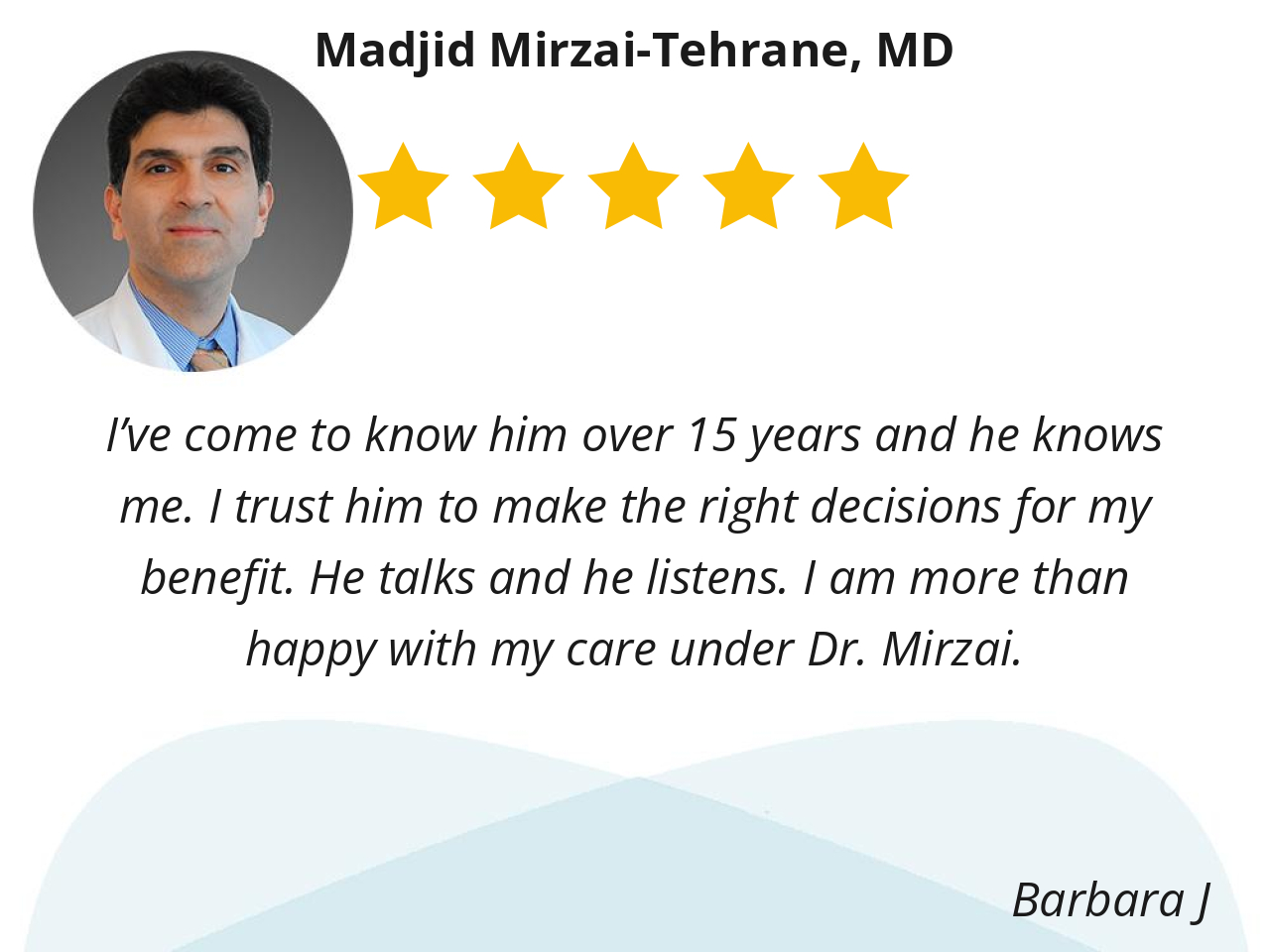 I’ve come to know him over 15 years and he knows me. I trust him to make the right decisions for my benefit. He talks and he listens. I am more than happy with my care under Dr. Mirzai.