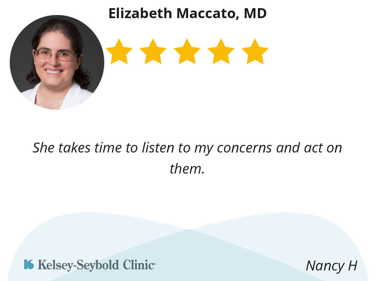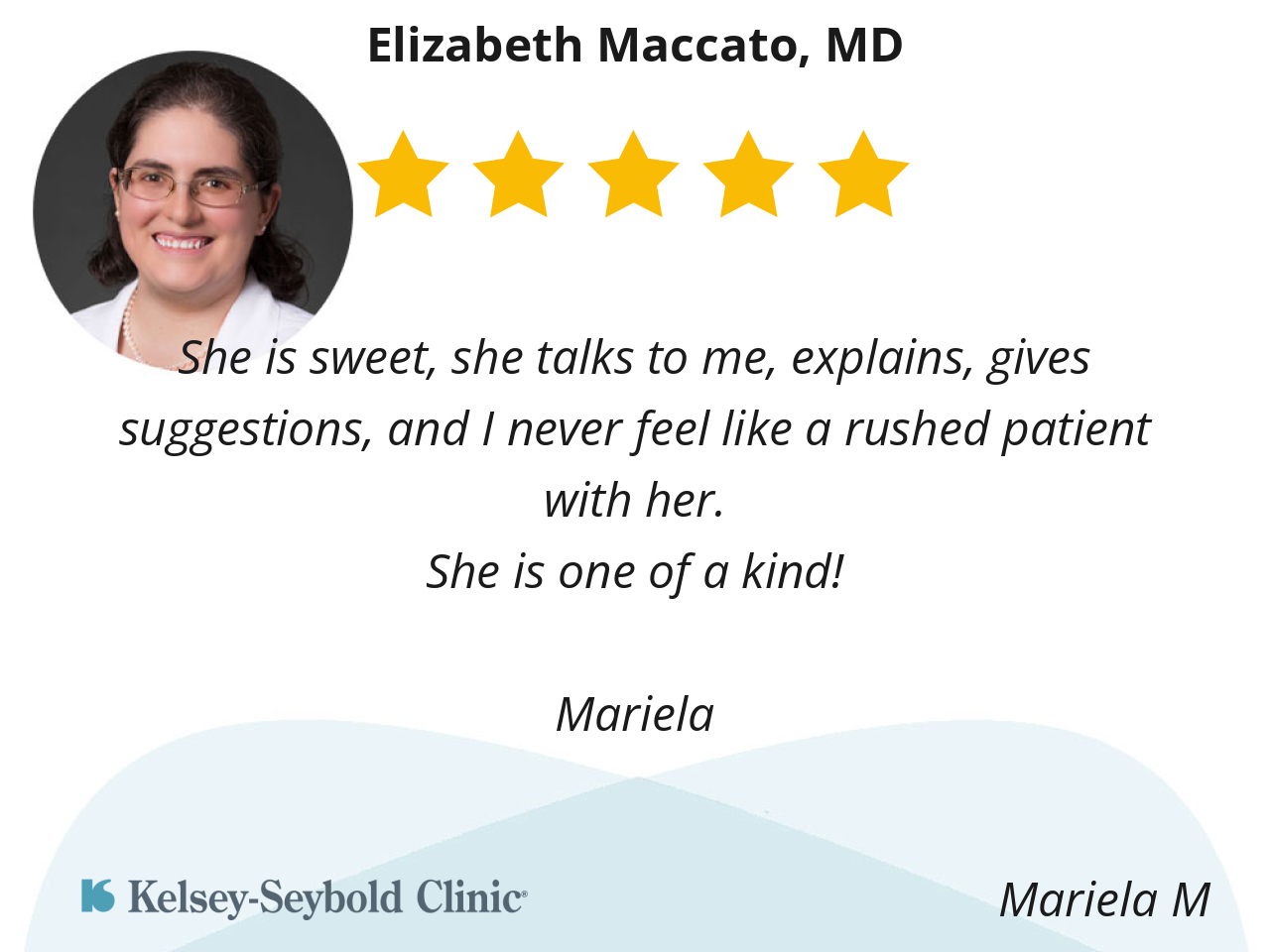 Doctor Elizabeth Maccato is patient, a good listener, shows interest, and strives to solve the/your problem.