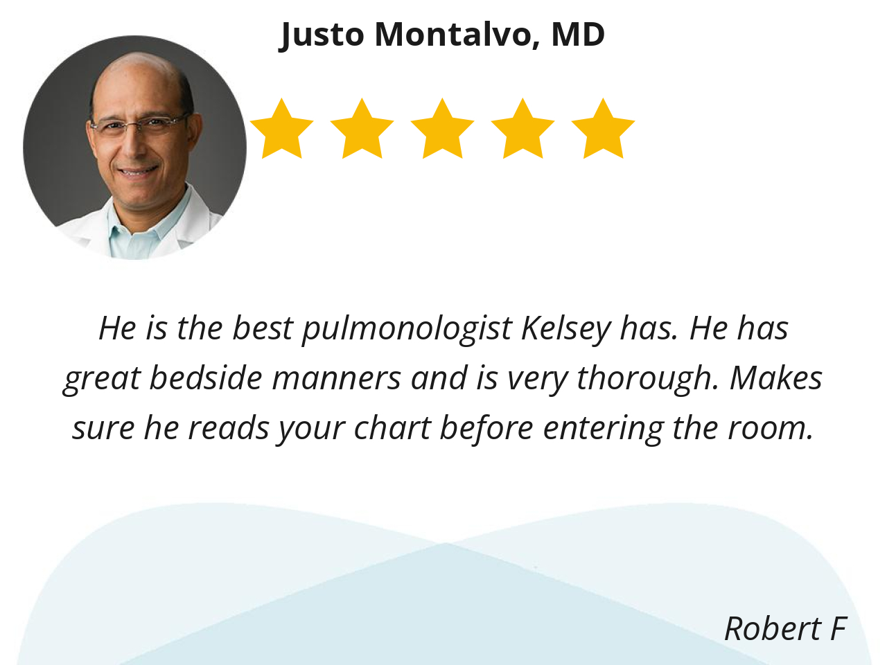 He is the best pulmonologist Kelsey has. He has great bedside manners and is very thorough. Makes sure he reads your chart before entering the room.