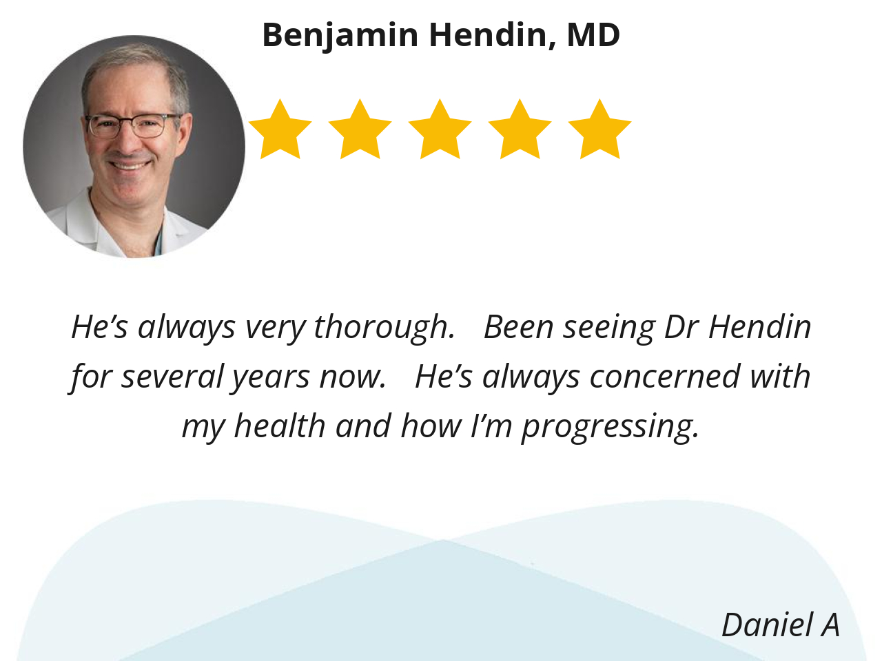 He’s always very thorough. Been seeing Dr Hendin for several years now. He’s always concerned with my health and how I’m progressing.