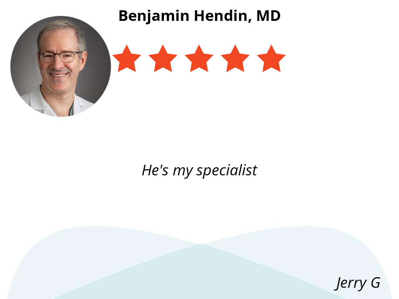 Dr. Hendin is a great and makes sure I receive the best medical treatment. For example, in my follow-up exams he ensures that my health is outstanding. Also, I like him as a person. Thank you, Kelsey-Seybold Clinic, for having Dr. Hendin as part your organization.