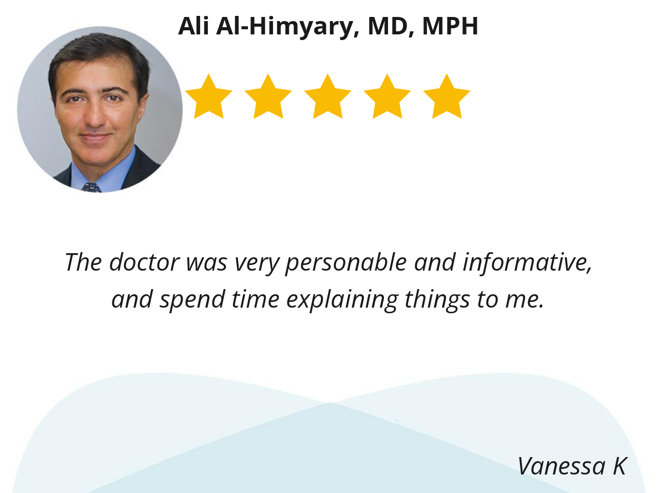 First and foremost Dr. Al assured me l was not going to die from what he was treating me for. And that was a real concern for me. And secondly l believed in him and trusted his judgement based on the diagnostic test he ordered and his commitment to his craft. Dr. Al listened to me and heard me, he didn’t over talk me. His ability to disarm my fears gave me calm , l was not rushed in or out and l did not feel like a one night stand. I TRUST HIM… This is my personal experience