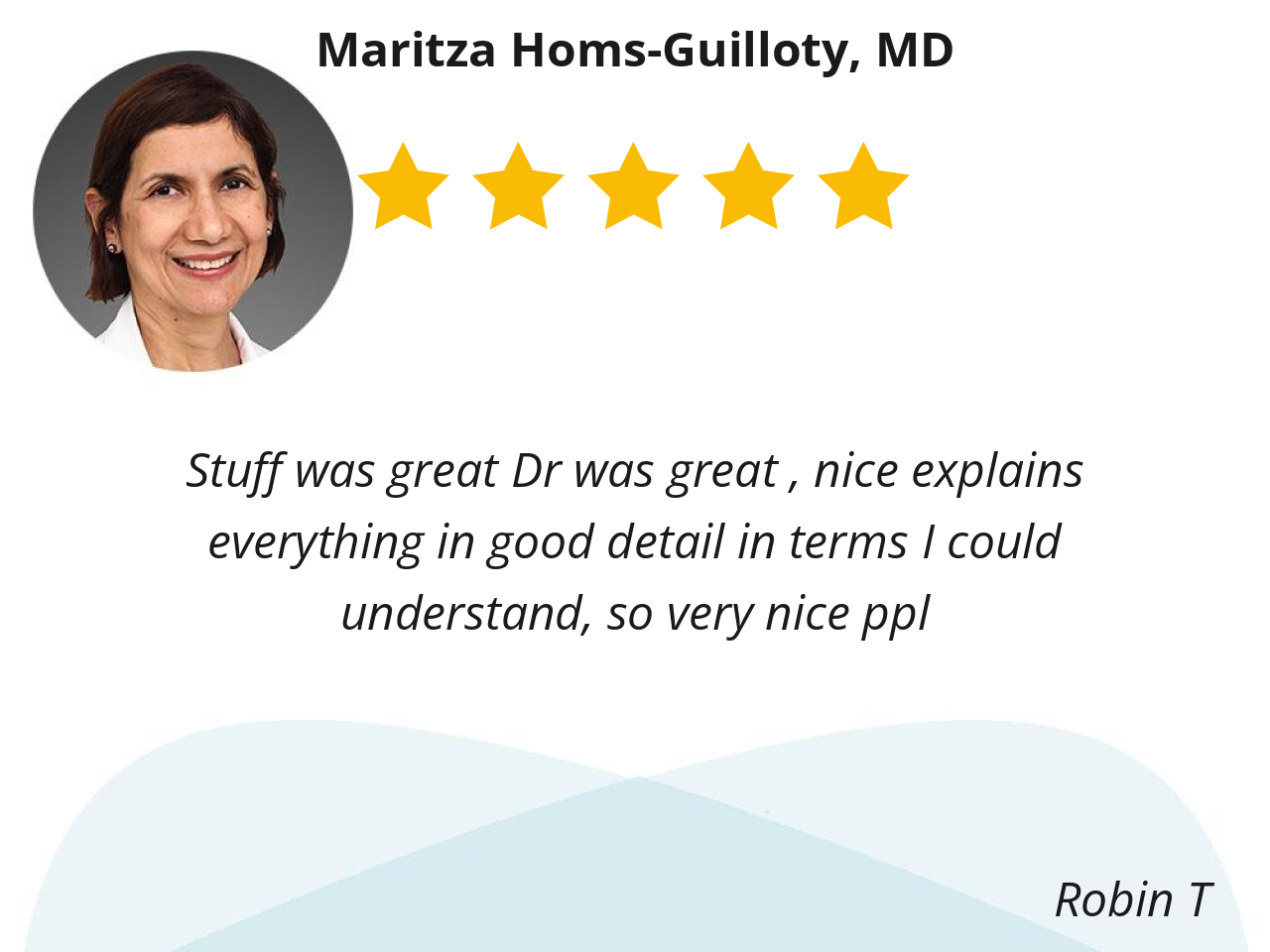 Dr. Homs was very professional and her expertise was great. I truly enjoyed my visit with her. I will be visiting with her more in the future re: my new prognosis. Thanks so much. Have a great day.