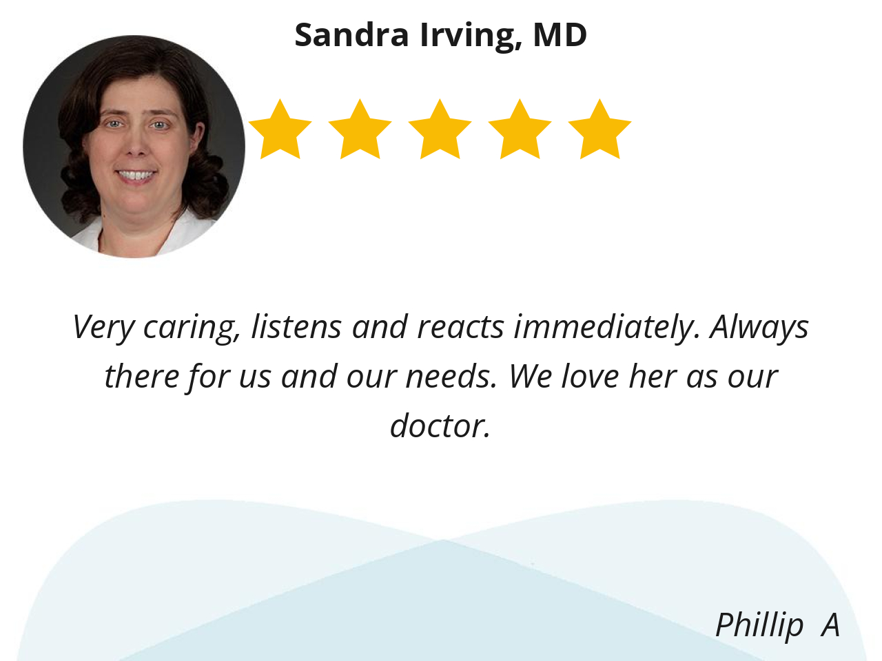 Dr Irving has been my PCP. Over 15 years. Always kind very thoughtful Doctor. Take time to talk her patients and figure out what's best for your medical condition..