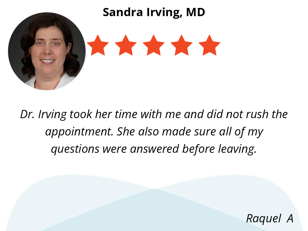 I like Dr. Irving because she is always courteous, very smart, likable and gets me taken care of in a timely manner but NEVER rushes.