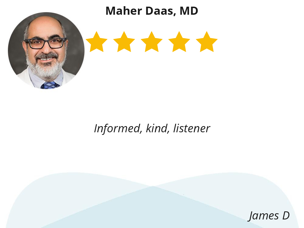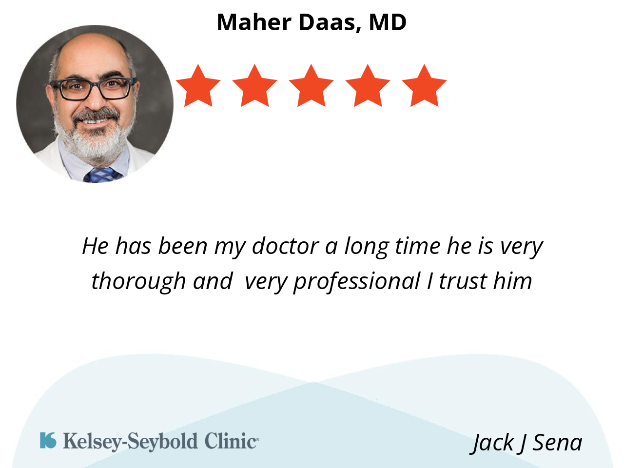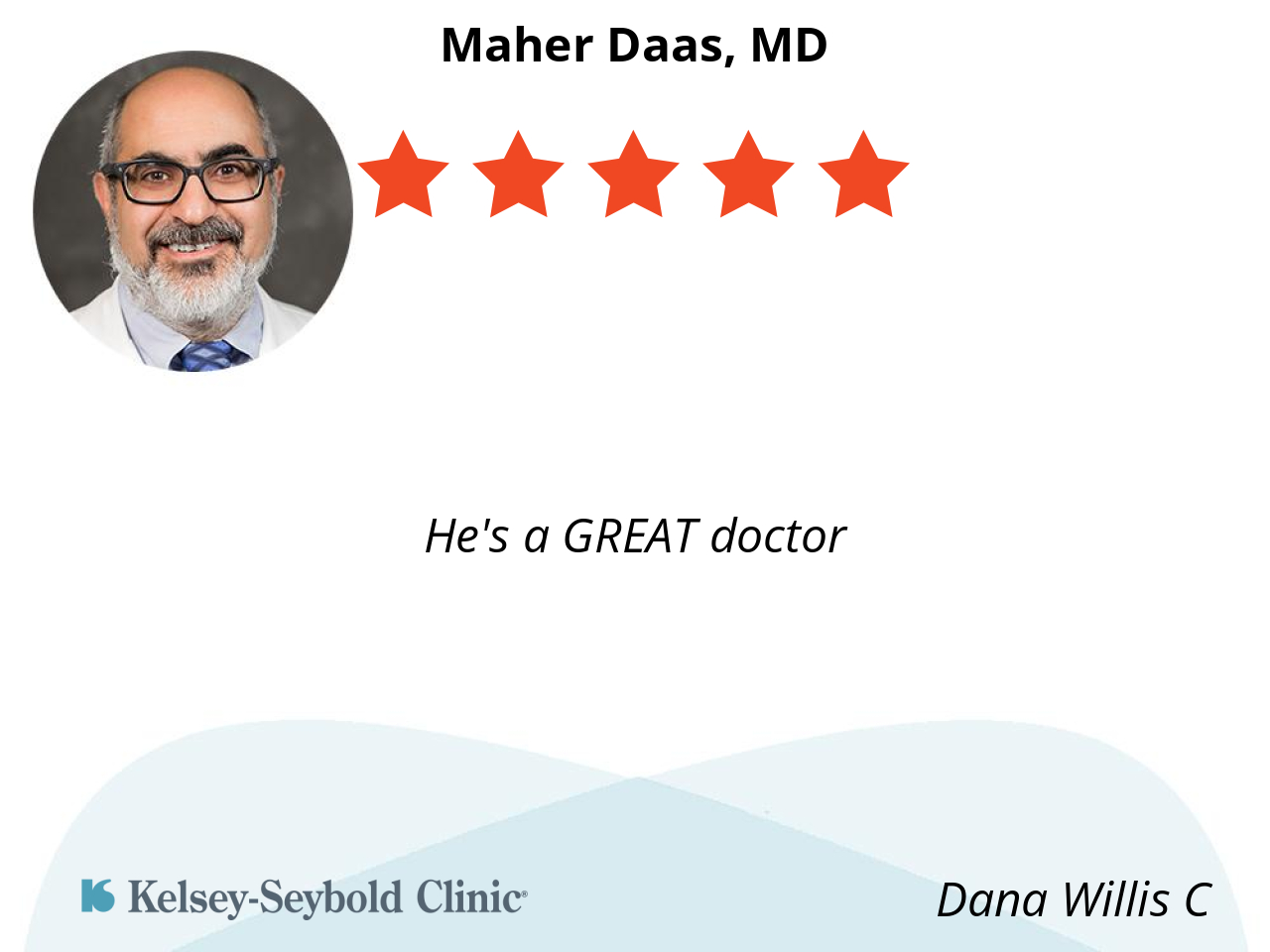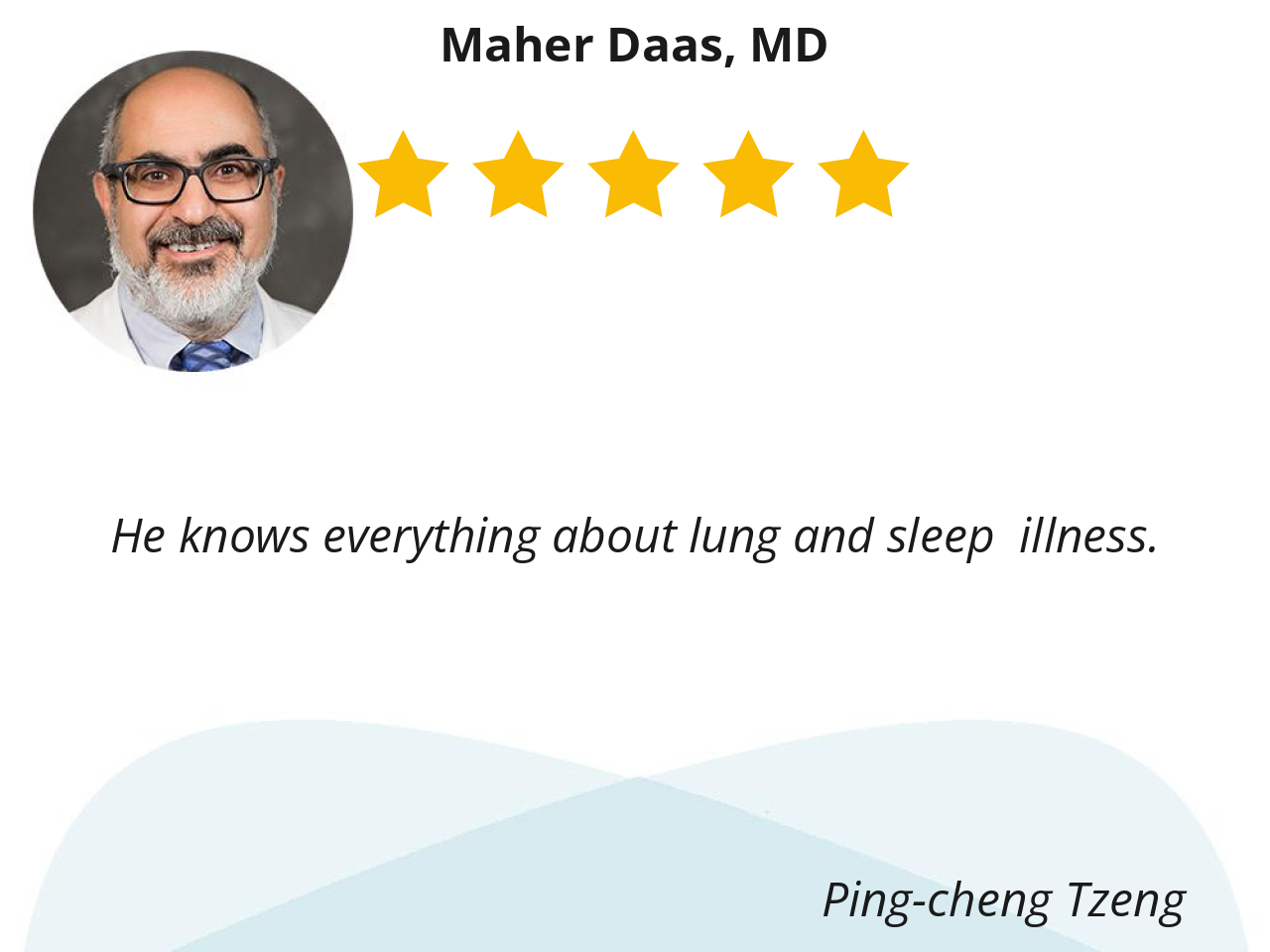 I had the pleasure of seeing Dr. Maher Daas via telemed visit, and my impression of him was that he genuinely cares about the welfare of his patients. He's a great listener and he took the time to explain anything that I didn't understand and for that I am grateful. I would definitely recommend him to a friend or family members for their pulmonary needs. He's definitely a keeper as far as physicians goes.