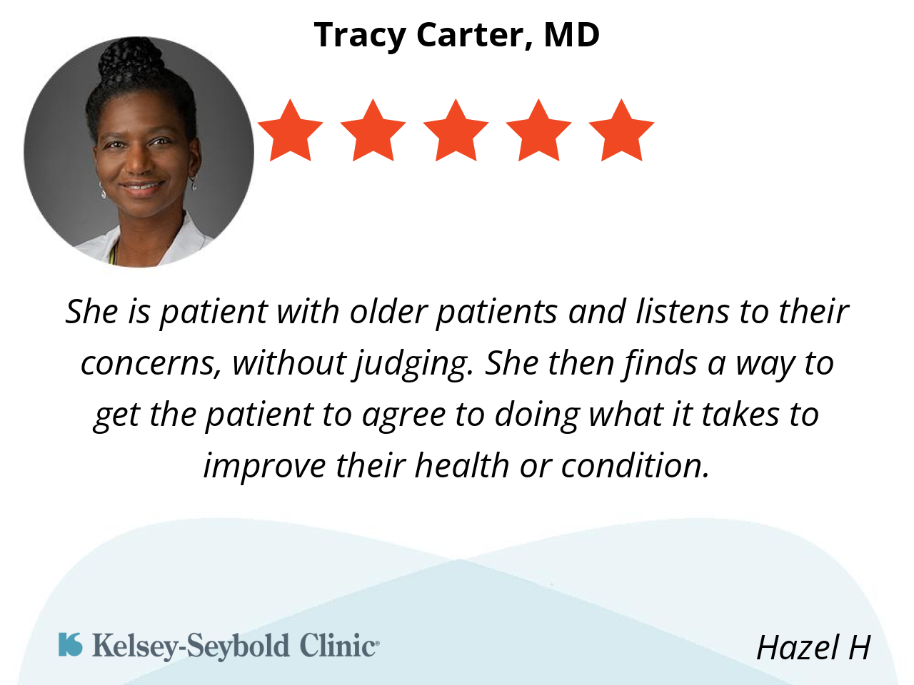 I greatly appreciate Dr. Carter. She is very thorough and explains everything in terms I can understand. She patiently listens when I have questions or concerns.