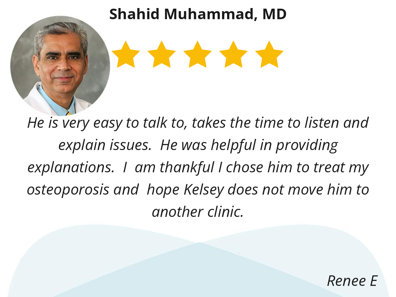He is very easy to talk to, takes the time to listen and explain issues. He was helpful in providing explanations. I am thankful I chose him to treat my osteoporosis and hope Kelsey does not move him to another clinic.