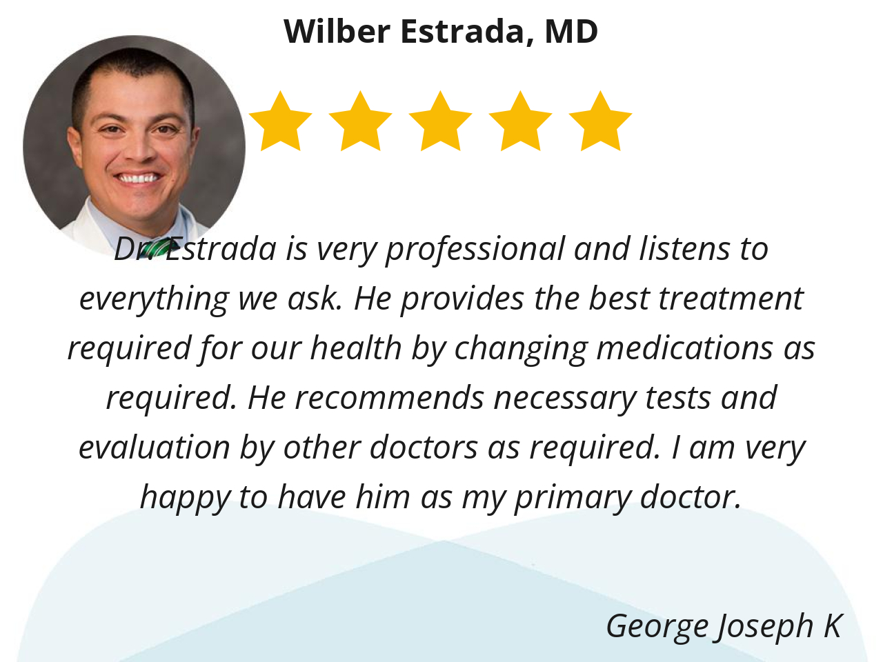 Dr. Estrada is very professional and listens to everything we ask. He provides the best treatment required for our health by changing medications as required. He recommends necessary tests and evaluation by other doctors as required. I am very happy to have him as my primary doctor.