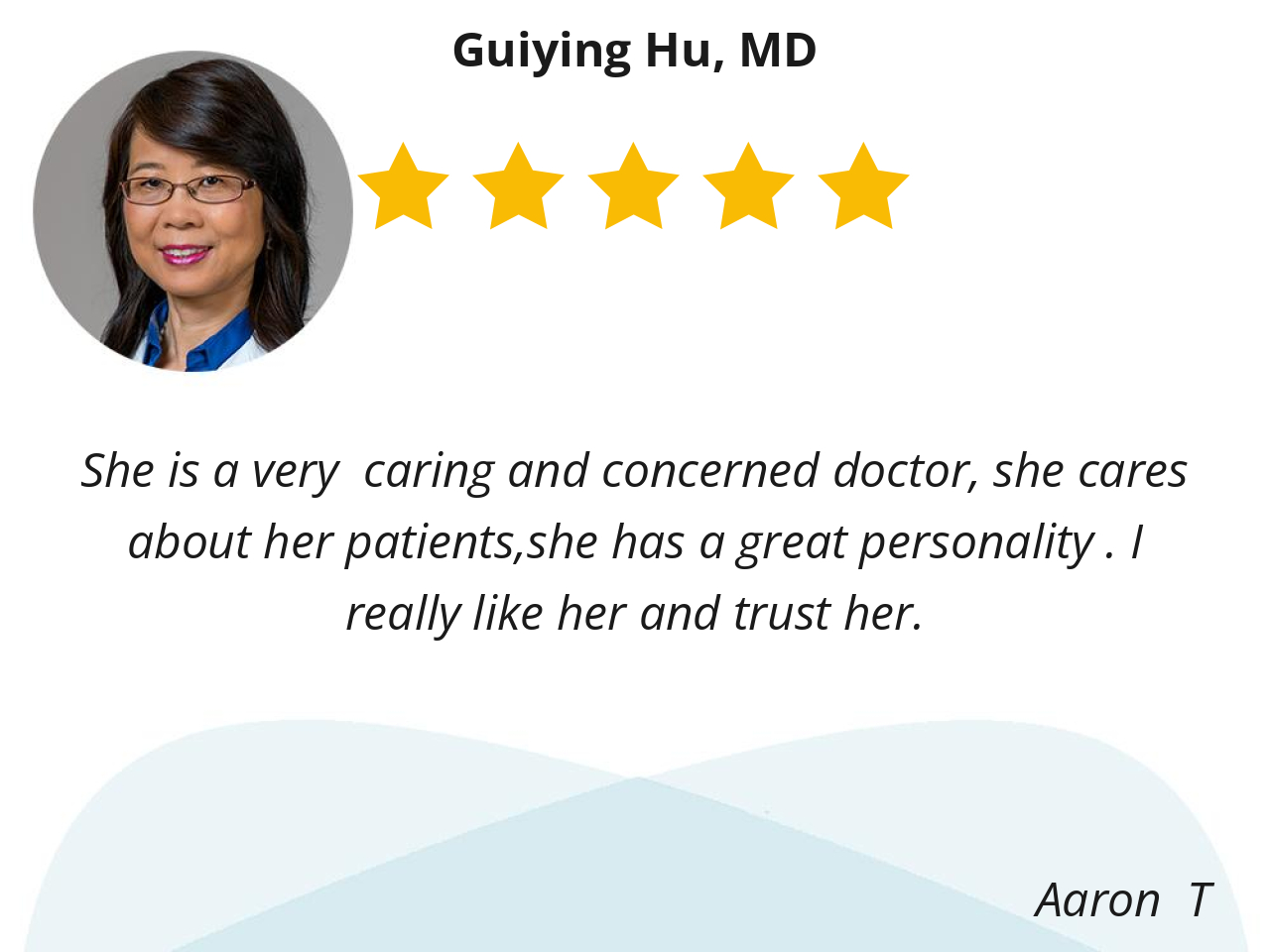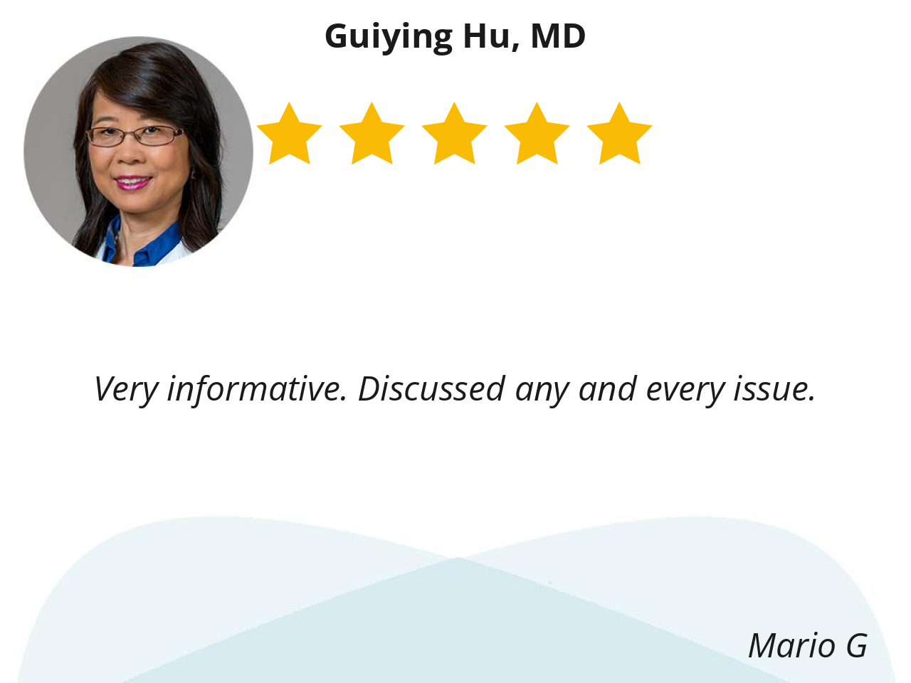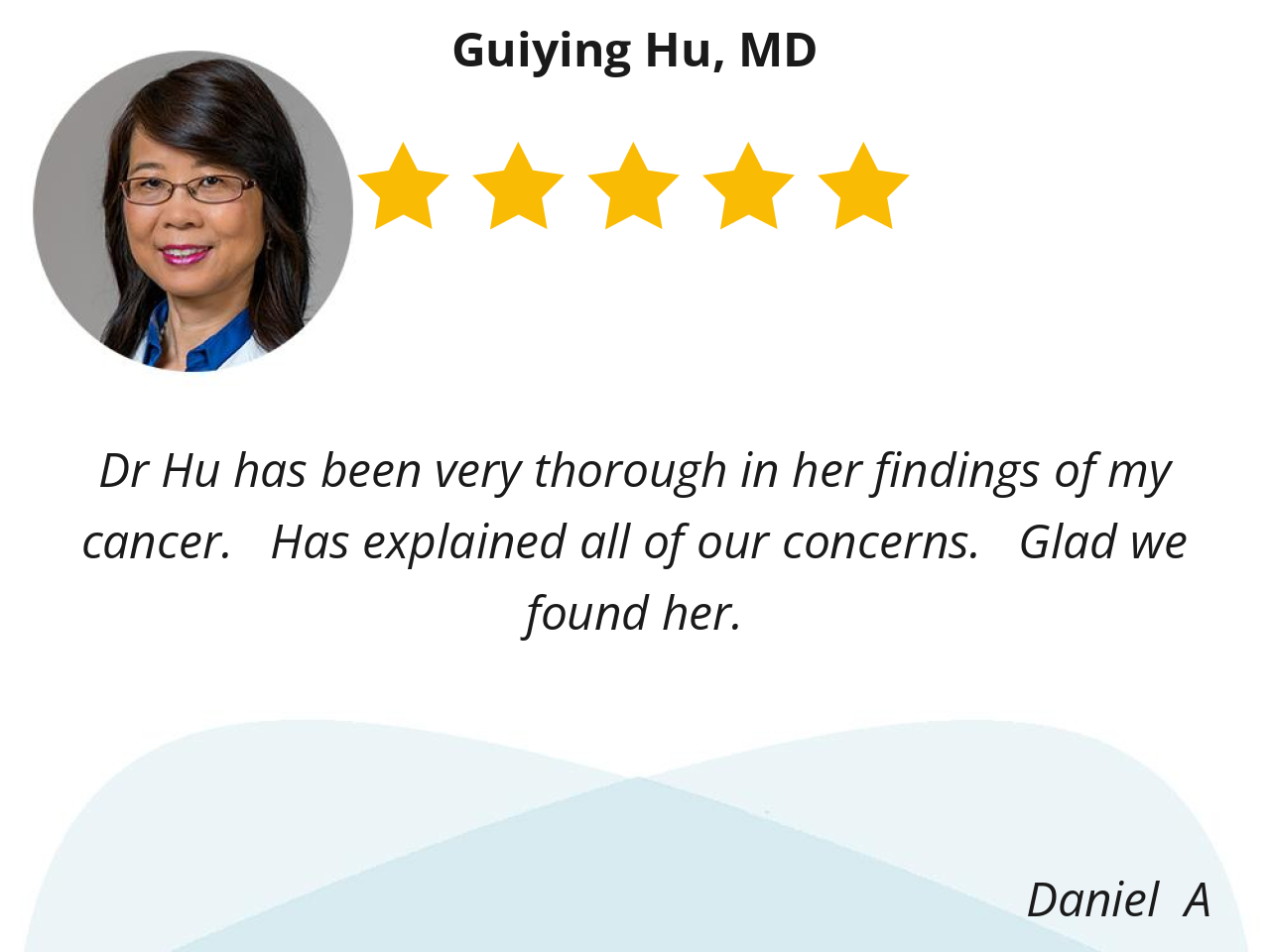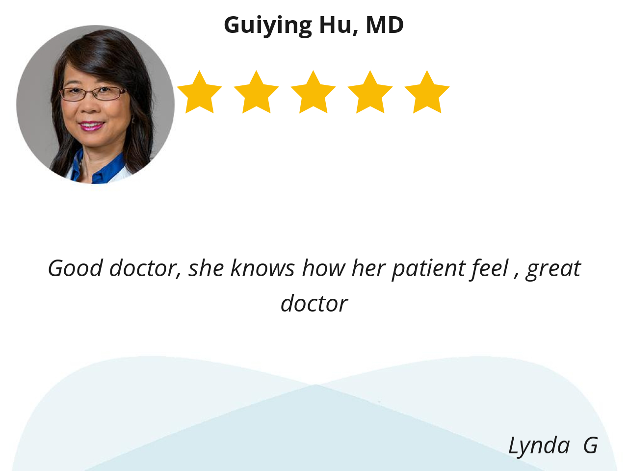 Dr. Hu is a wonderful doctor! She has been my Oncologist since 2015 and has handled my medical care for cancer with precision. This is my second time having cancer. It was Dr. Hu who was responsible for making sure that I followed through with her advice to see other doctors, regarding surgeries, etc. Dr. Hu was also the person that introduced me to medications that have been helpful with my cancer situation. I pray that God forbid my ever having cancer again. However, if I do, Oncologist, Dr. Guiying Hu will definitely be the doctor that I will seek for help!
