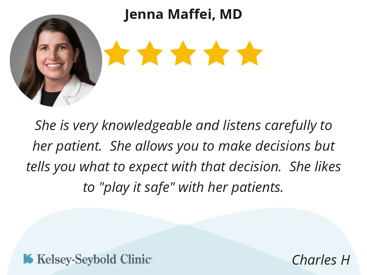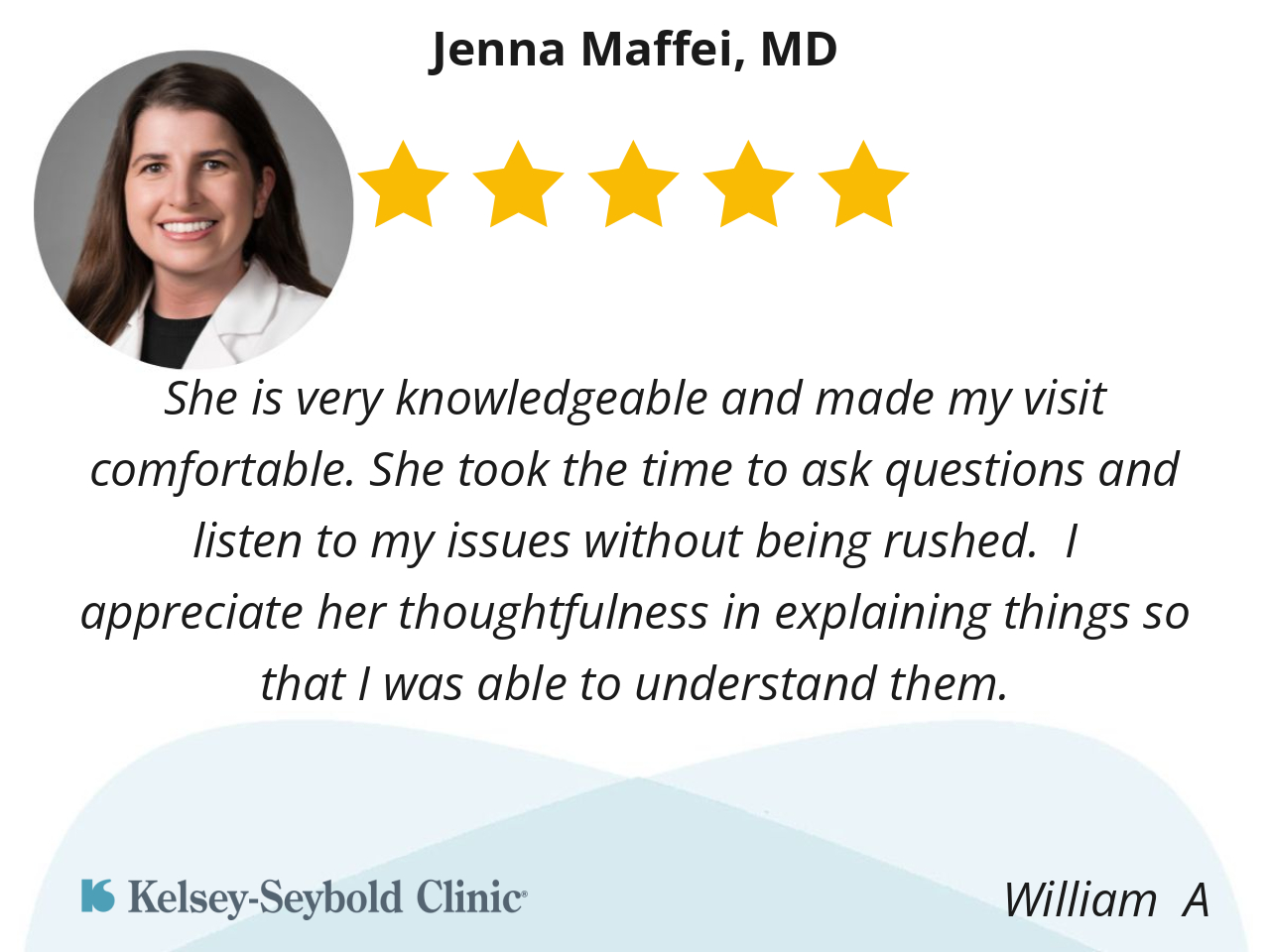 Dr. Maffei and her staff were all amazing. She listened to everything I had to say, fully considered all my symptoms and thoughts, and took the time to explain everything to me fully. She, the nurse, and the assistant were all warm and reassuring while being completely professional.