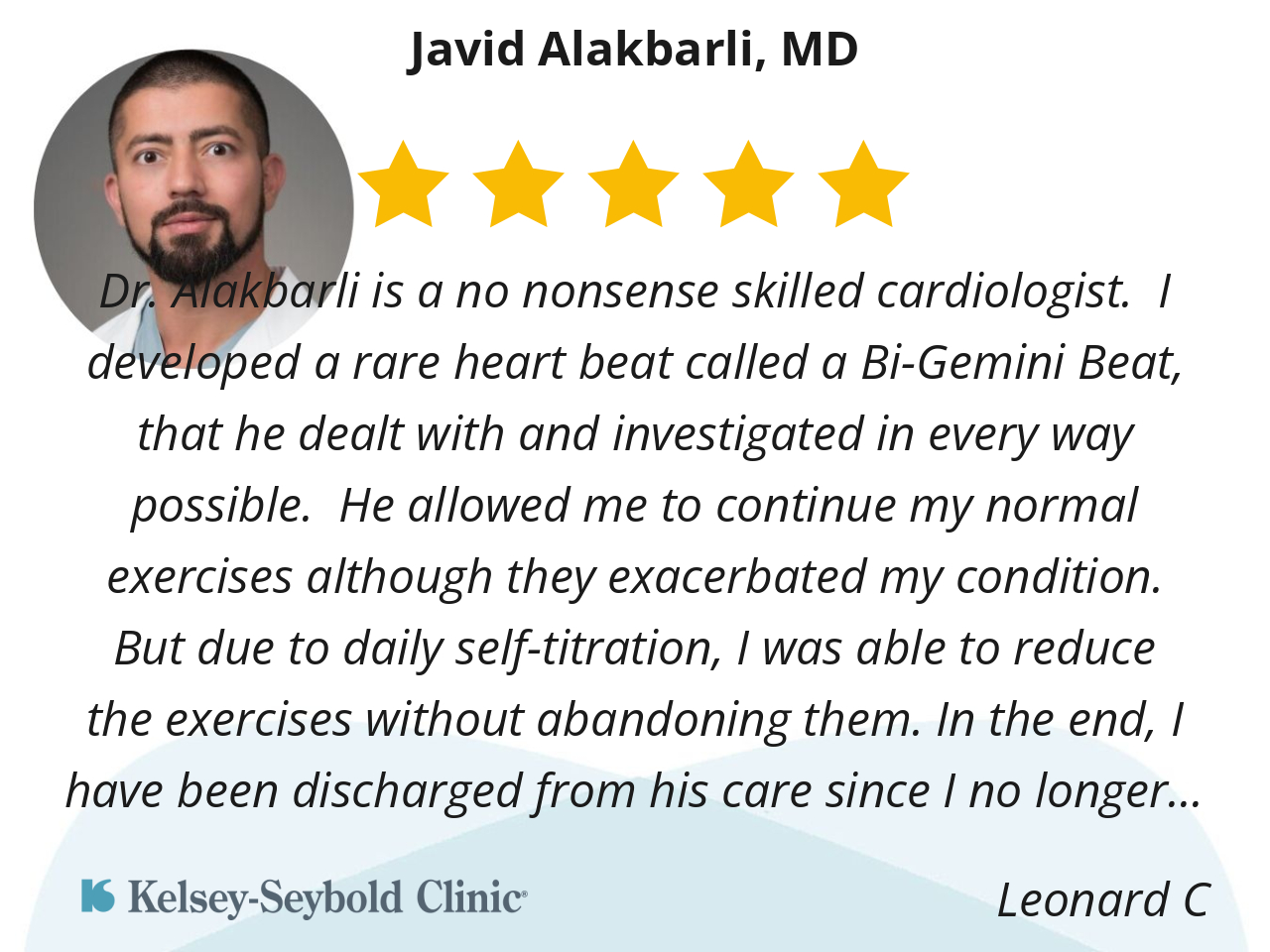 Dr. Alakbarli is a no nonsense skilled cardiologist. I developed a rare heart beat called a Bi-Gemini Beat, that he dealt with and investigated in every way possible. He allowed me to continue my normal exercises although they exacerbated my condition. But due to daily self-titration, I was able to reduce the exercises without abandoning them. In the end, I have been discharged from his care since I no longer have to take any medicines and all my heart rhythms are now normal.