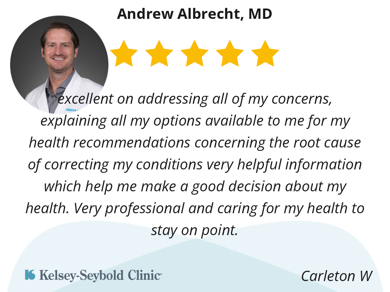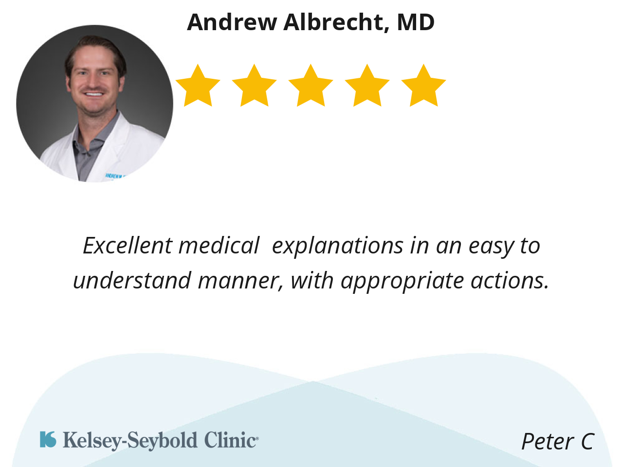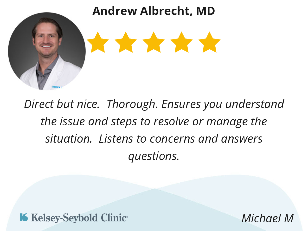 Dr. Albrecht was friendly and professional. He listened carefully and answered my questions with helpful information. I left the appointment feeling encouraged about my health.