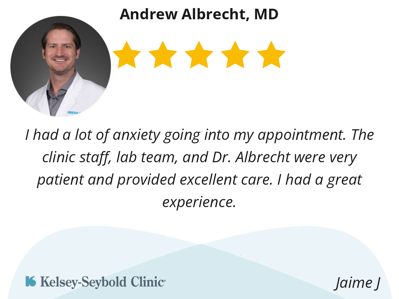 I had a lot of anxiety going into my appointment. The clinic staff, lab team, and Dr. Albrecht were very patient and provided excellent care. I had a great experience.