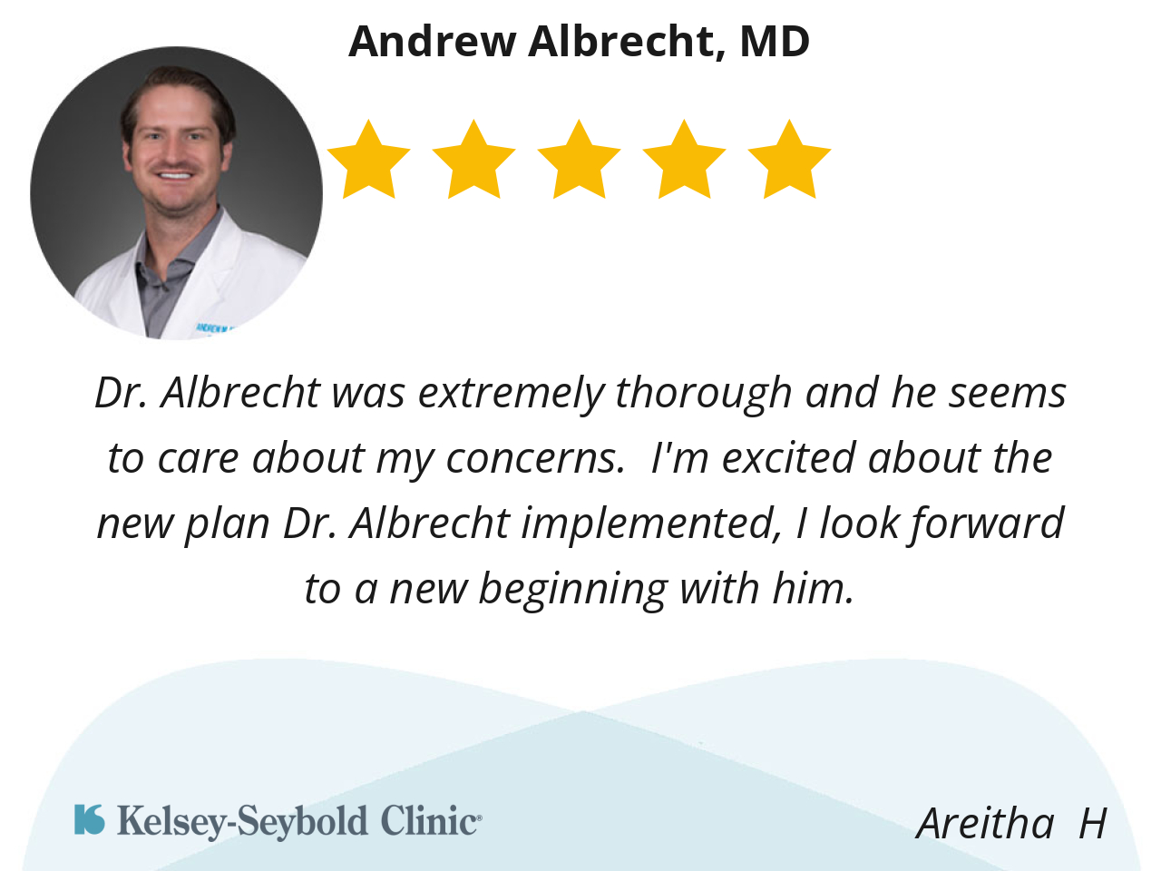 Dr. Albrecht was extremely thorough and he seems to care about my concerns. I'm excited about the new plan Dr. Albrecht implemented, I look forward to a new beginning with him.