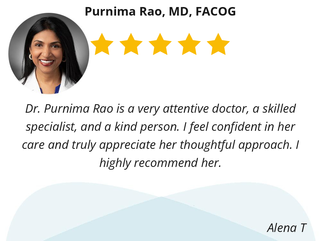 Dr. Rao has always been personable yet professional at all times. She has the best bedside manners that l look for in doctor's to have. I would always recommend her to other women in my circle that are looking for a good gynecologist.